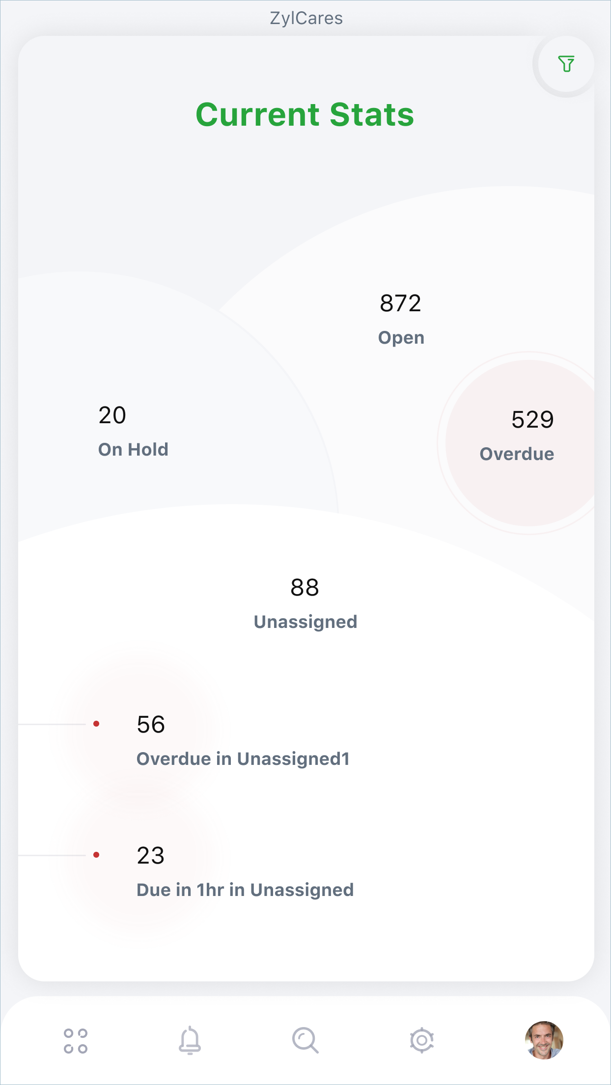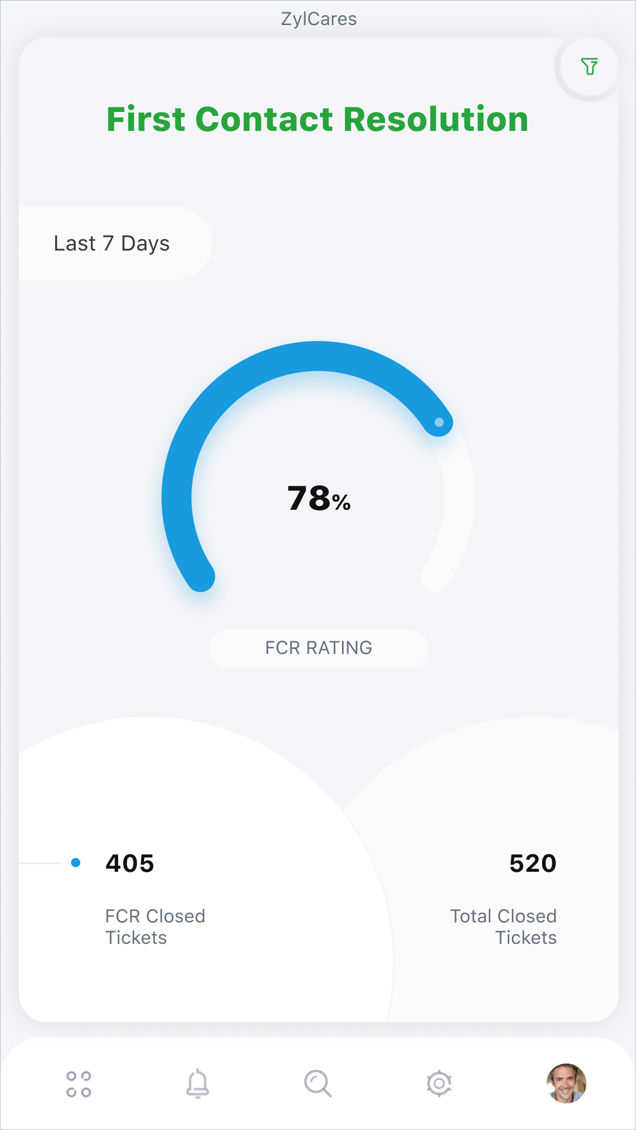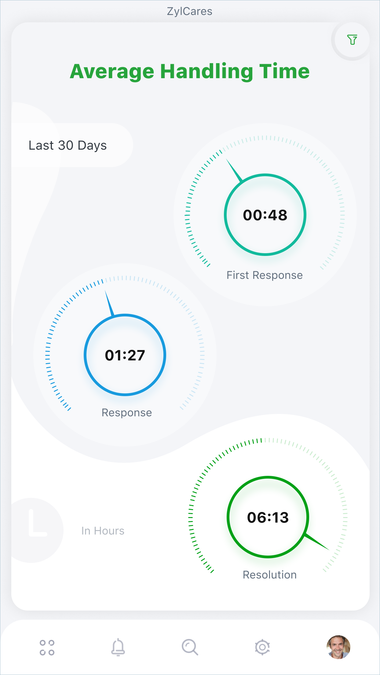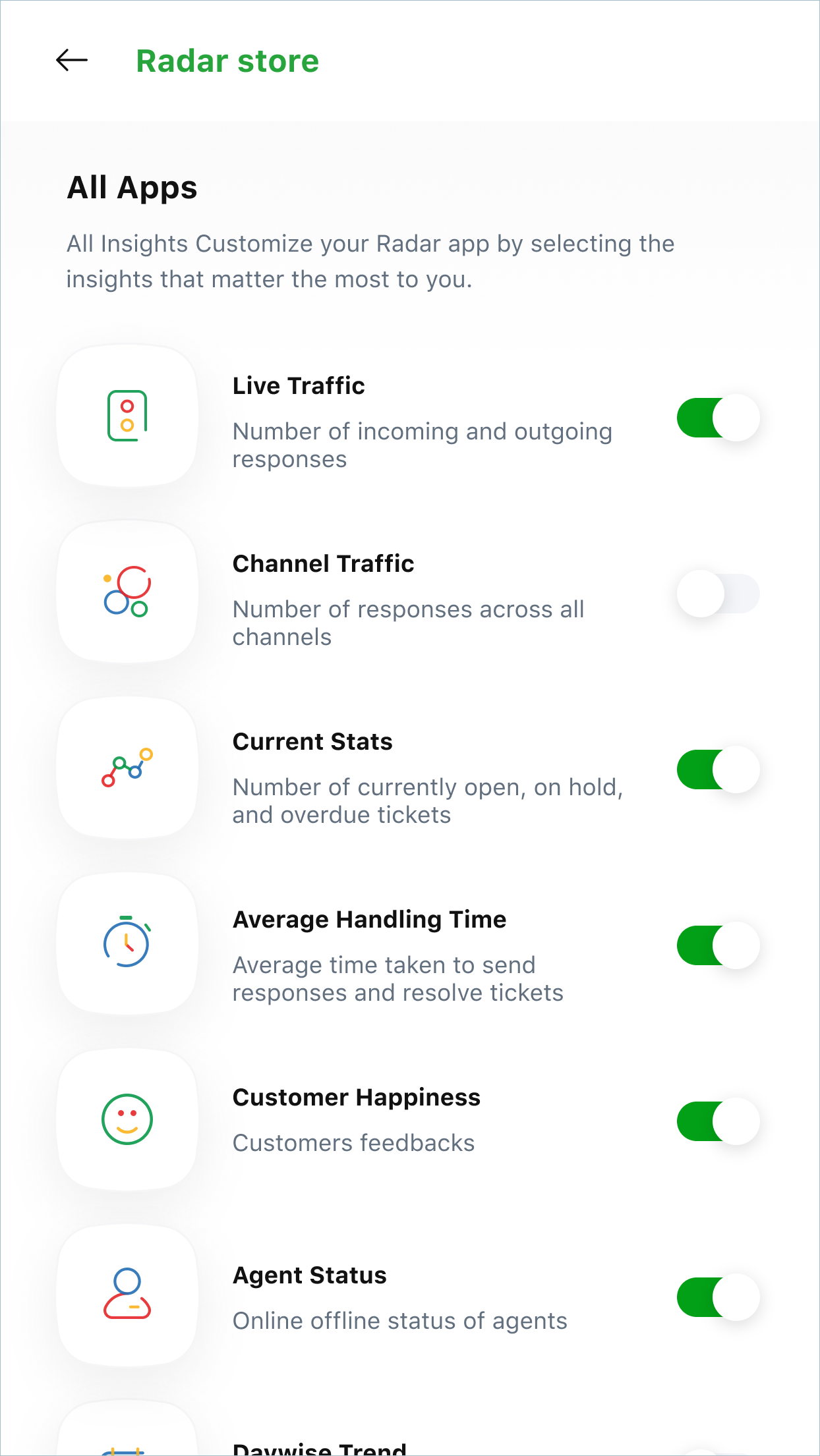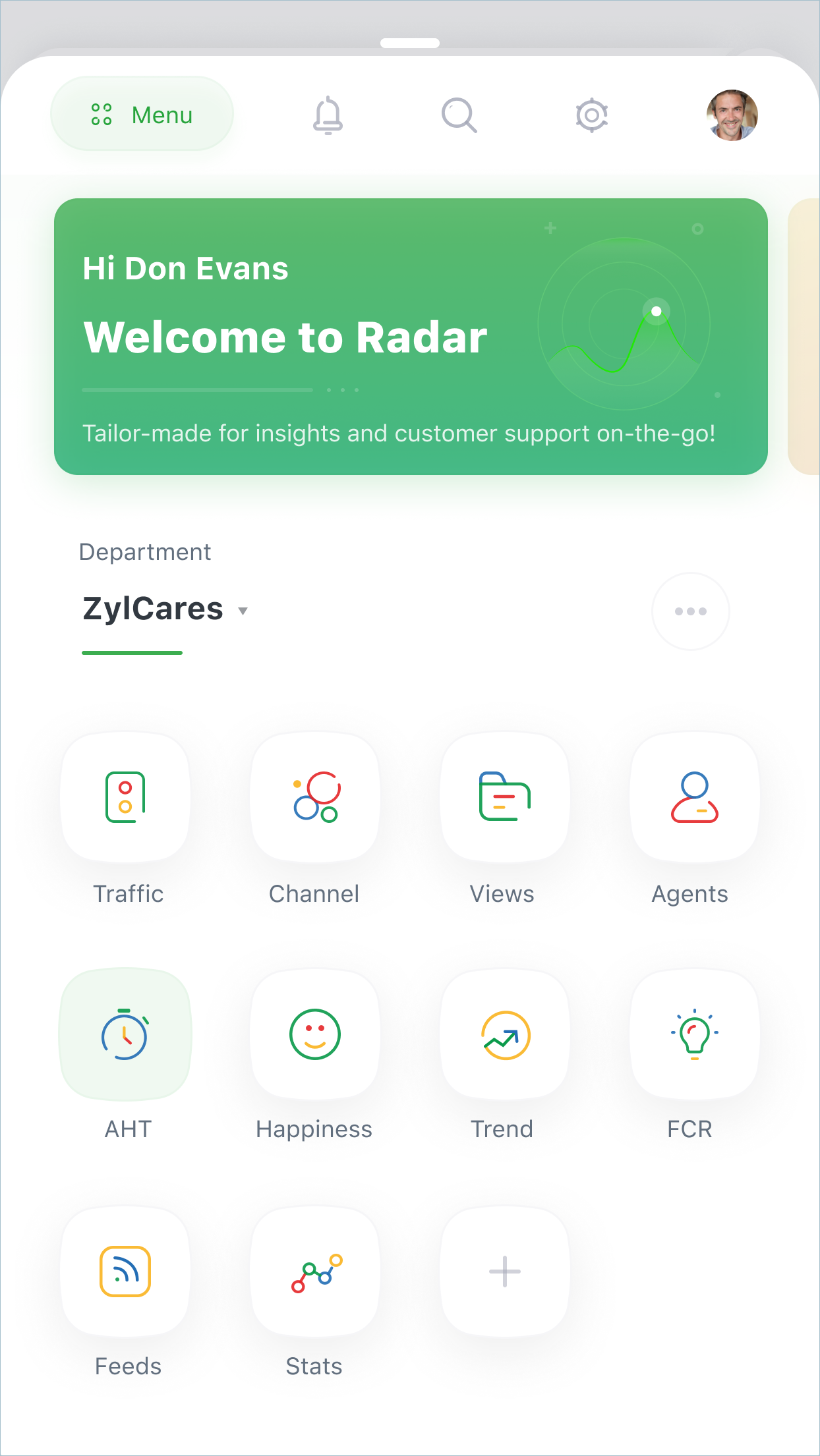 Radar provides stats related to various critical areas, including ticket resolution time, customer happiness, live traffic, and individual agent stats. Each stat is updated in real time and displayed on a dedicated screen on the app, providing specific insights that lead to effective decision-making. While managers/admins can view these stats for all agents, agents can view only those pertaining to themselves.