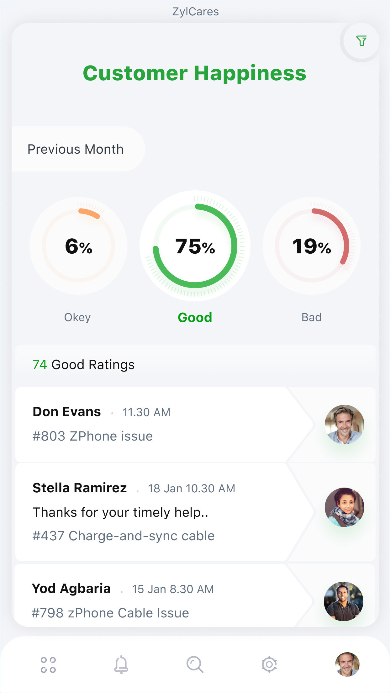Customer Happiness: Displays the overall customer happiness stats of the help desk over a specific period. This information helps identify both satisfactory interactions and areas for improvement.
