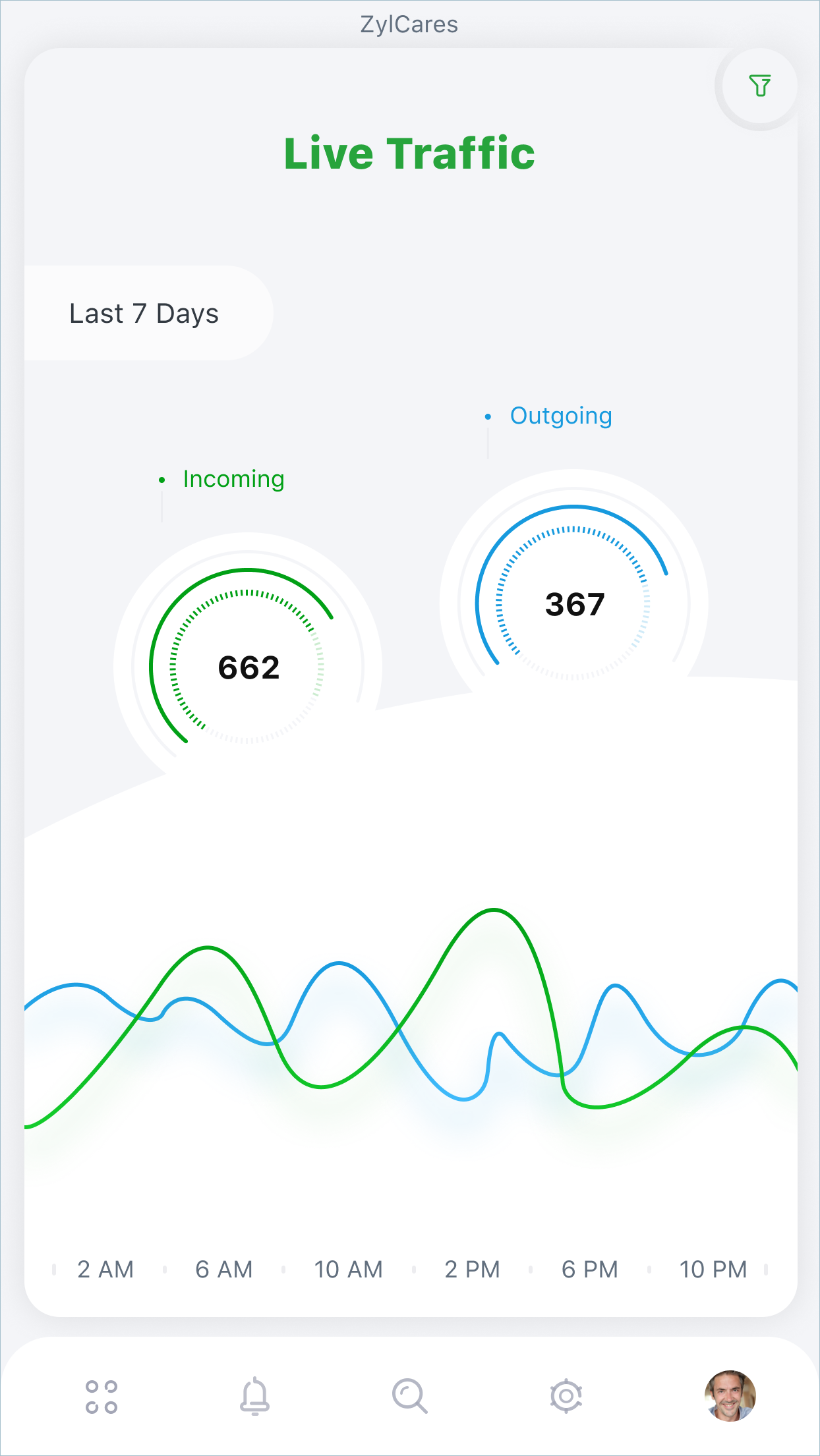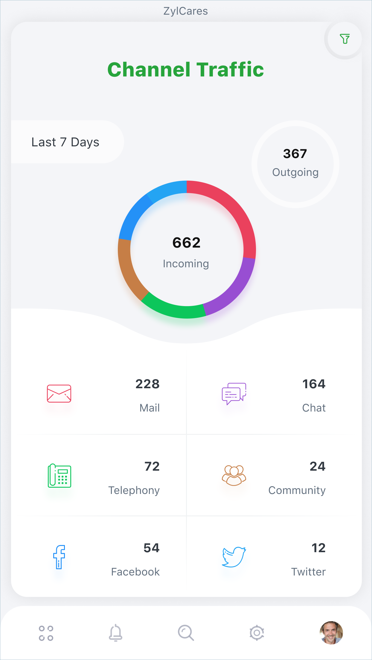 Live Traffic: Displays the number of incoming and outgoing conversations sent and received in a specific period. You can also filter traffic by a specific agent on this screen, to check their workload. If an agent seems to be receiving more tickets than they can possibly handle, you can regulate their workload by assigning some incoming tickets to a different agent.