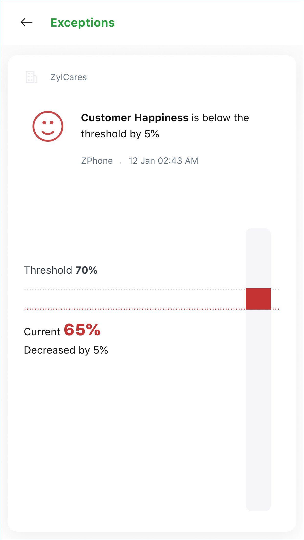 Exception Alerts: Displays alert messages that are triggered when deviations occur in pre-defined standards for customer service stats. For instance, you can configure Radar to send you an alert message when the customer happiness rating goes below 85% or if the Average Handling Time of tickets exceeds the standard time set. This functionality helps you identify any bottlenecks in your support operations and take corrective action where necessary.