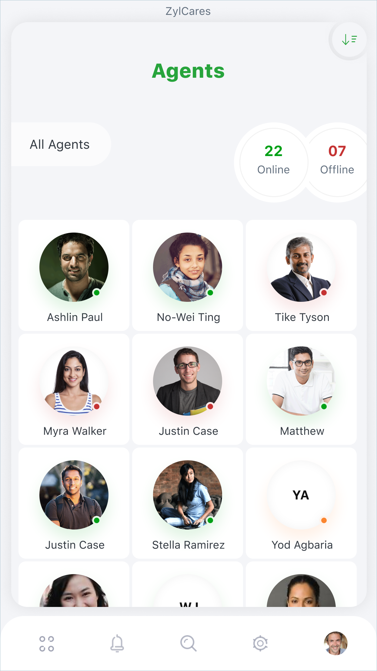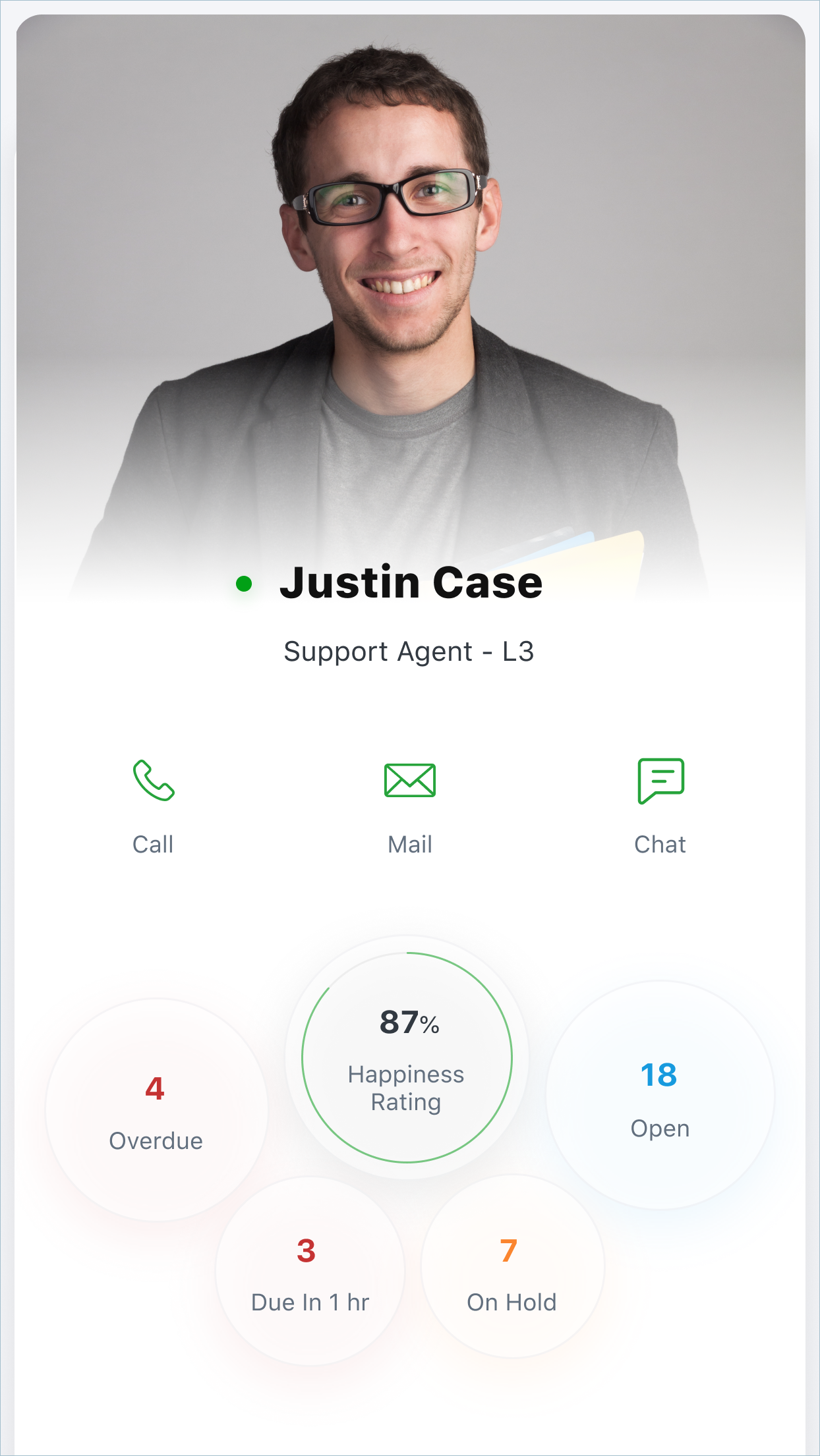 Agent Status: Displays all users who are part of the help desk, along with their availability status. Tapping the image of an agent on this screen opens the agent's detail screen, which displays individual information, such as their ticket stats, customer satisfaction rating, contact details, and department.