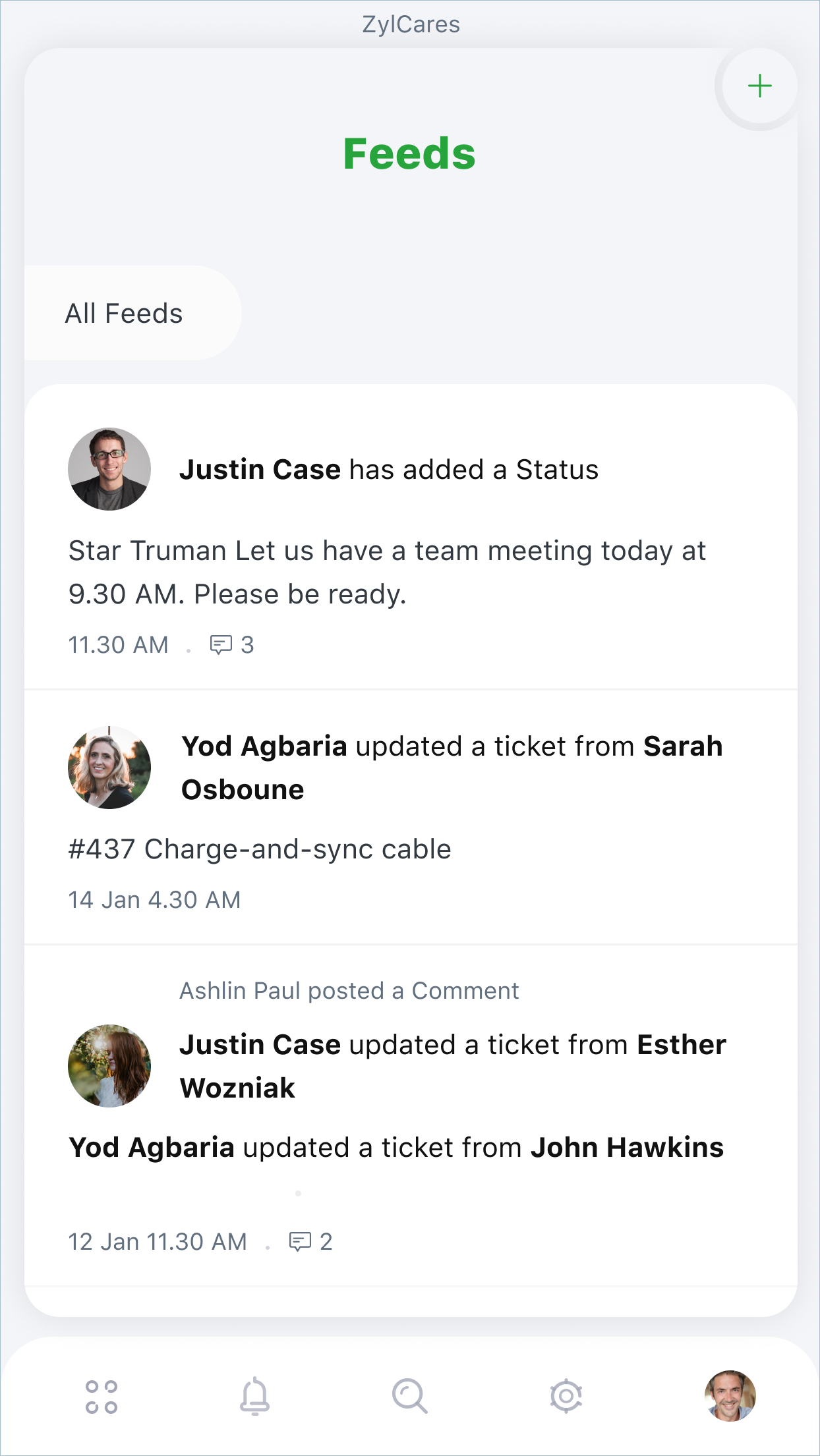Feeds: Displays the different interactions happening within the help desk. This information helps you stay up-to-date with the conversations going on and intervene where required.