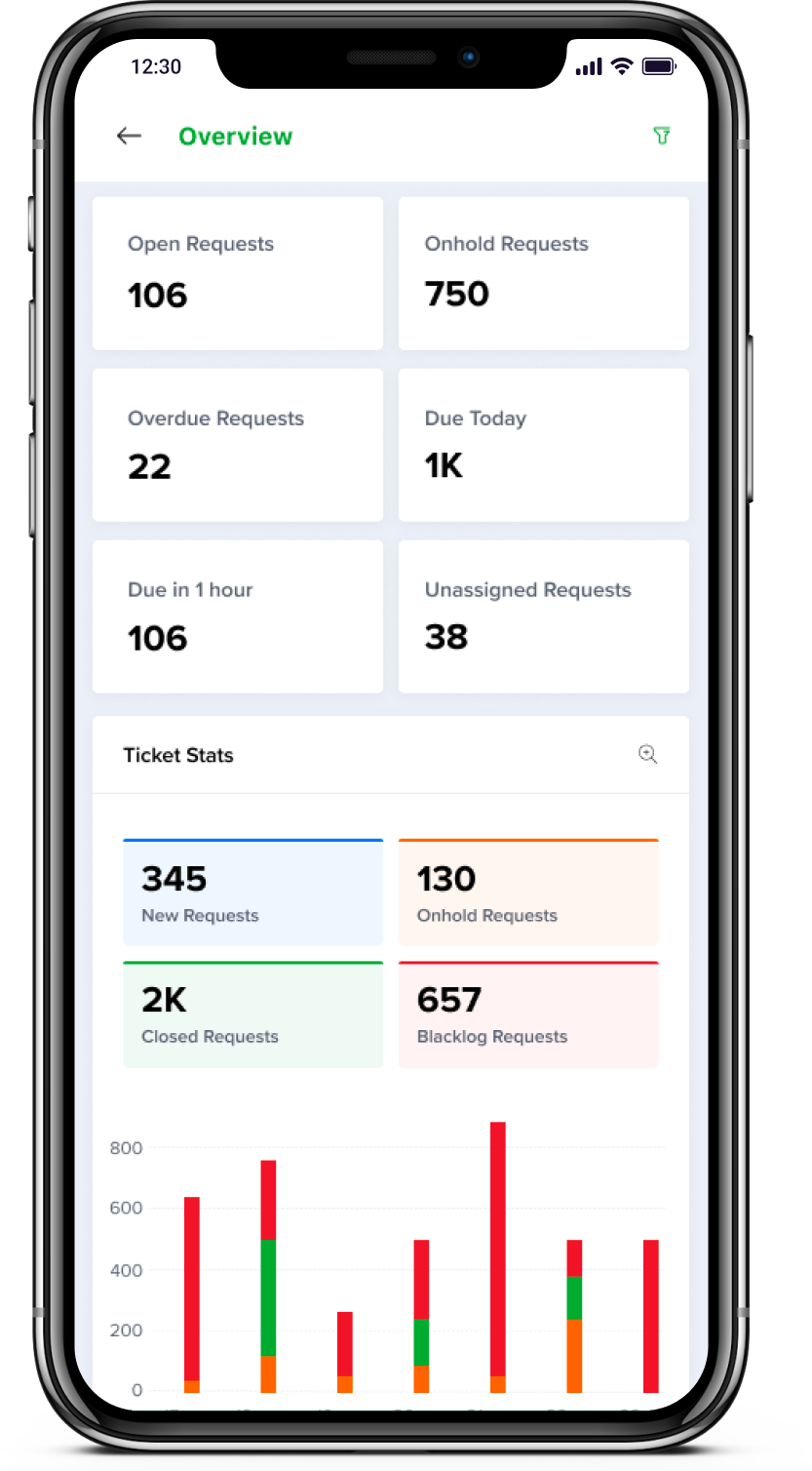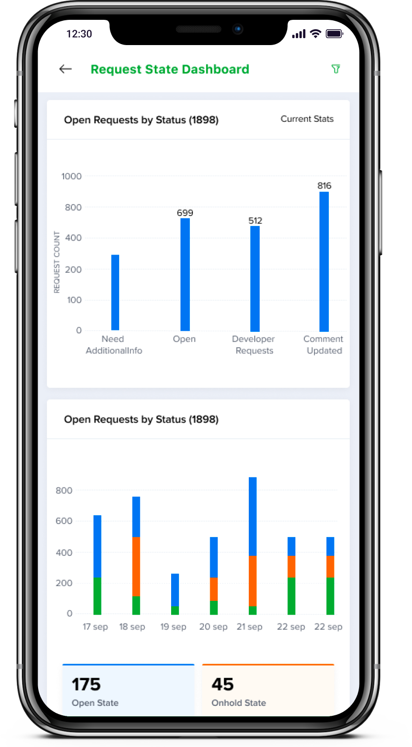 Requests by state | The number of tickets in each state is illustrated in a stacked graph. | Get insights on how efficiently the tickets are resolved. |