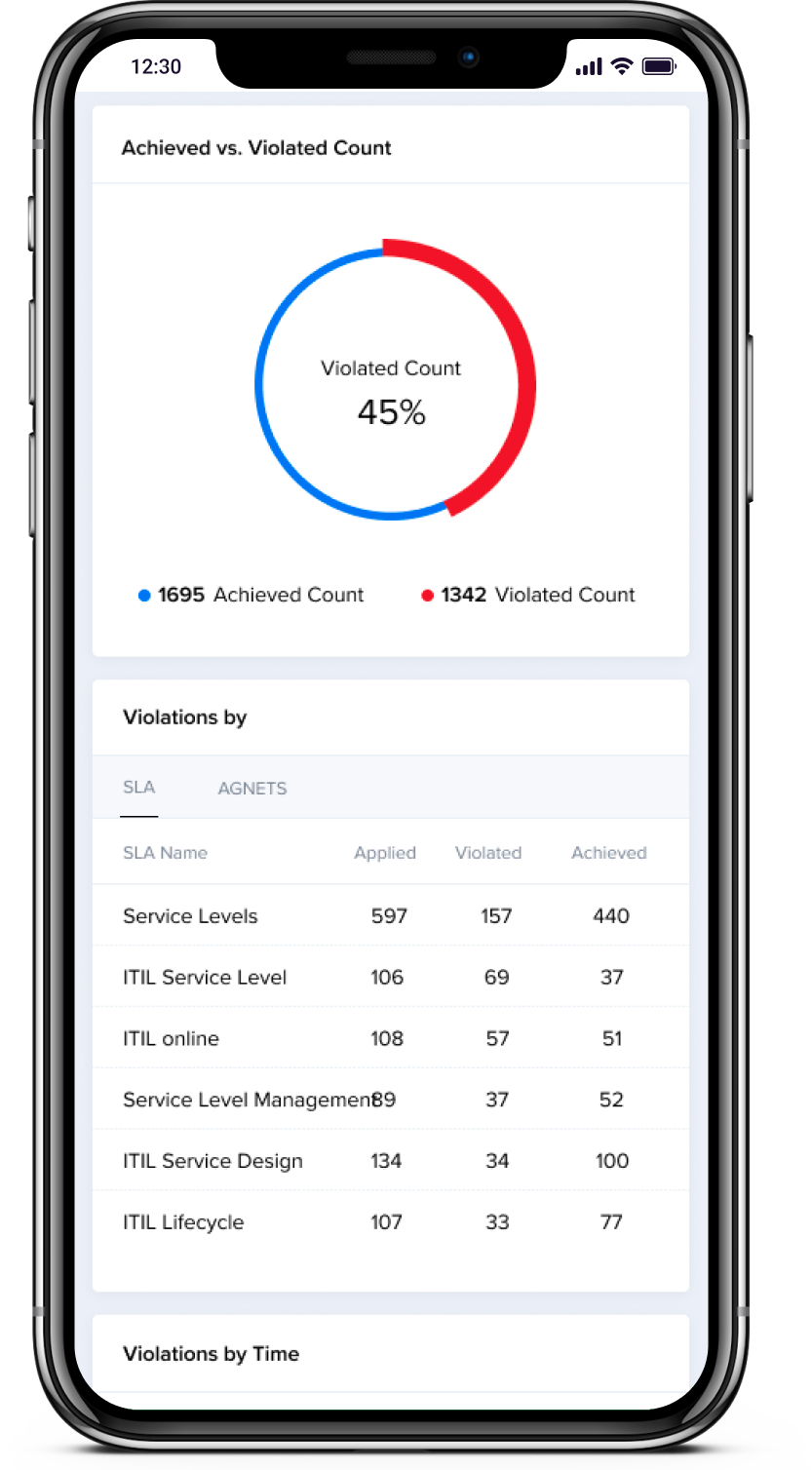 SLA overview report | Displays the number of SLA violated tickets, SLA violations, residual time and violation time as cards. | Get an overview of these key SLA health signifiers in a glance. |