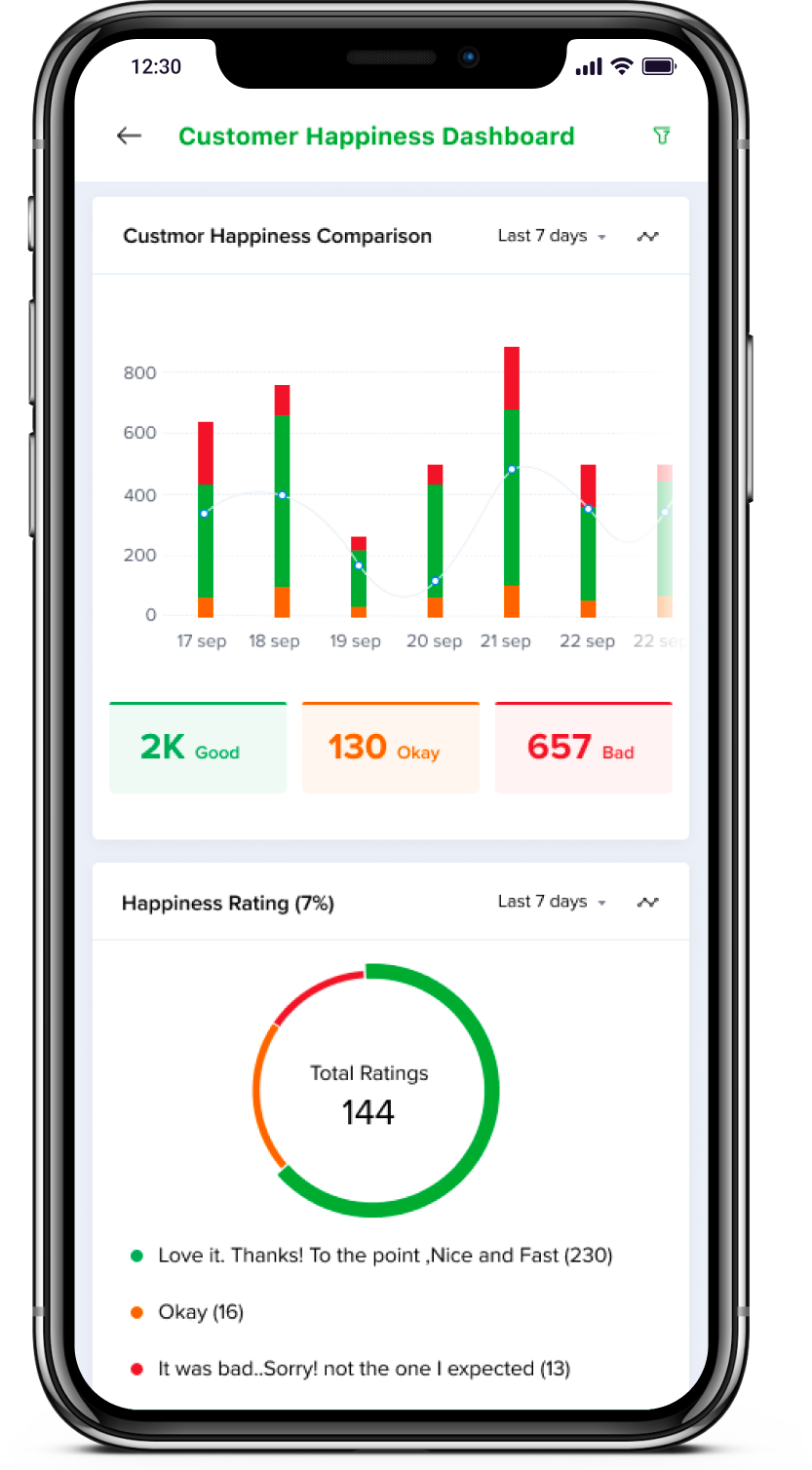 Happiness Rating | The number of good, okay, and bad ratings received along with the total count depicted as a pie chart. | Find out if your customers are happy with your service. |