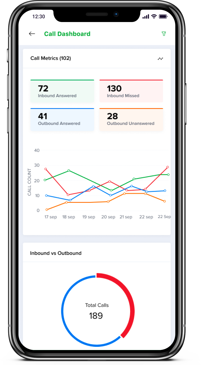 Inbound answered vs missed | A donut chart depiction of the number incoming calls that were answered and missed. | When you know the number of calls you've missed, you can drill down to the reason behind missing those calls and schedule follow-ups. |