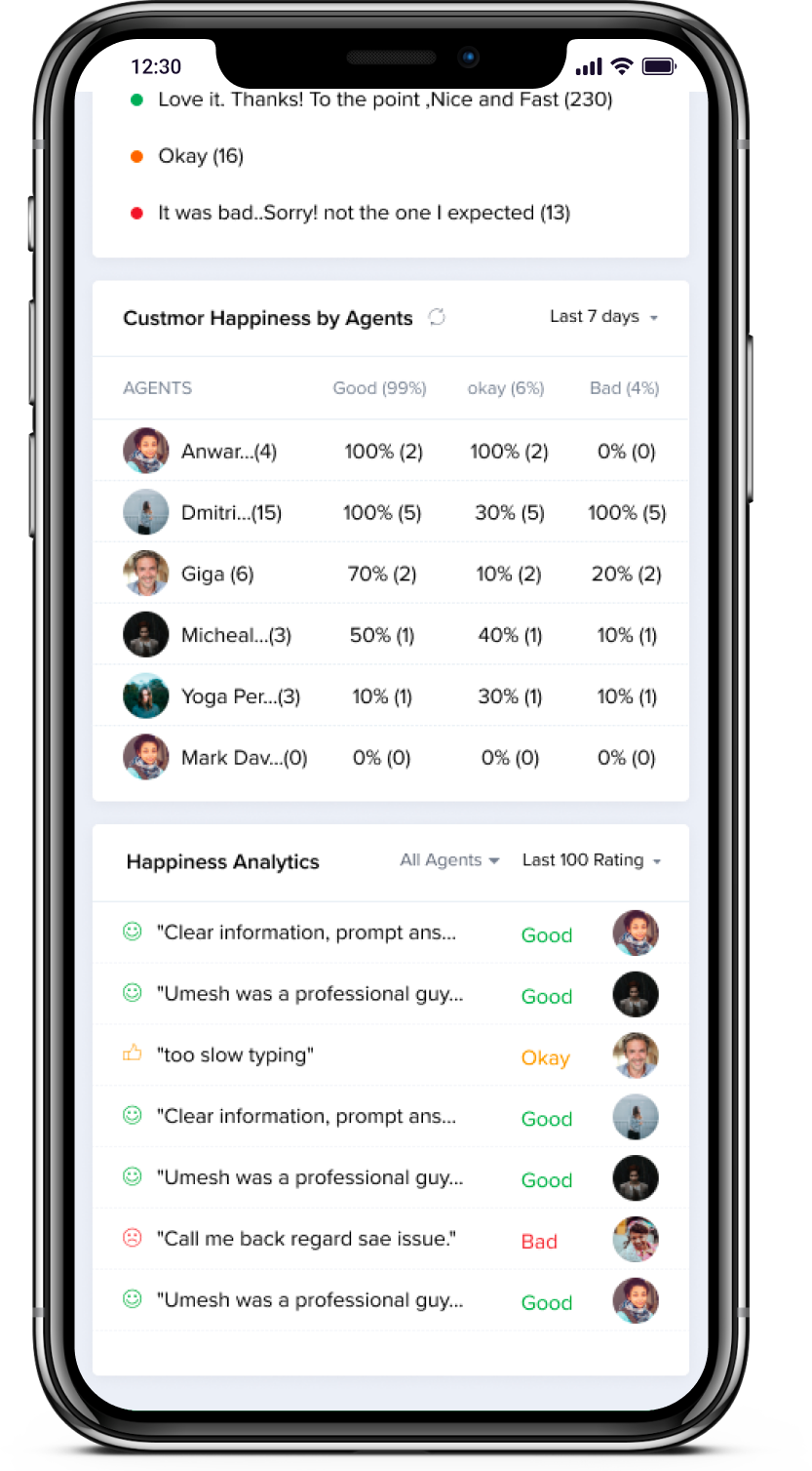 Happiness rating by agents | A tabular view of the percentage and count of good, bad, and okay ratings each agent received. | Evaluate agent performance and set targets for your team. |