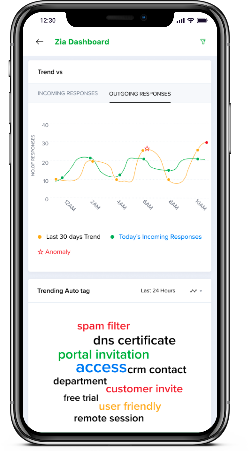 Trend | Multi-line graphs to show the trend in incoming/outgoing responses for the present day and the previous 30 days along with anomalies. | Identify peak and drop times along with anomalies. These insights can be used to manage resource allocation. |