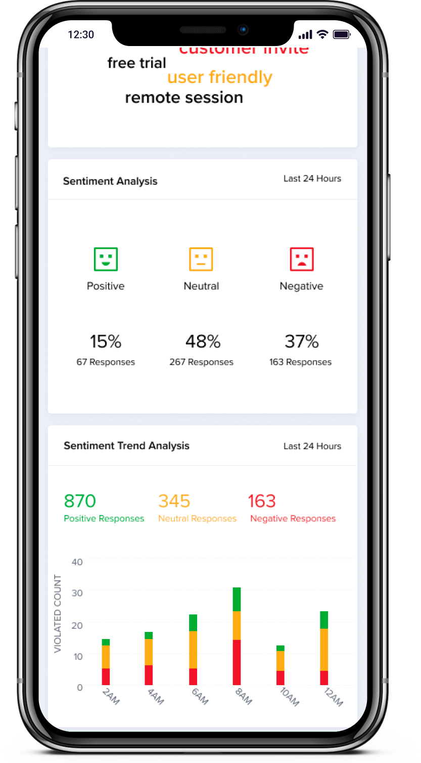 Sentiment analysis | The count and percentage of positive, neutral and negative sentiments in ticket responses, depicted using appealing emoticons. Time frame - last 24 hours | Get insights on the general sentiment of customers towards your business and service. |