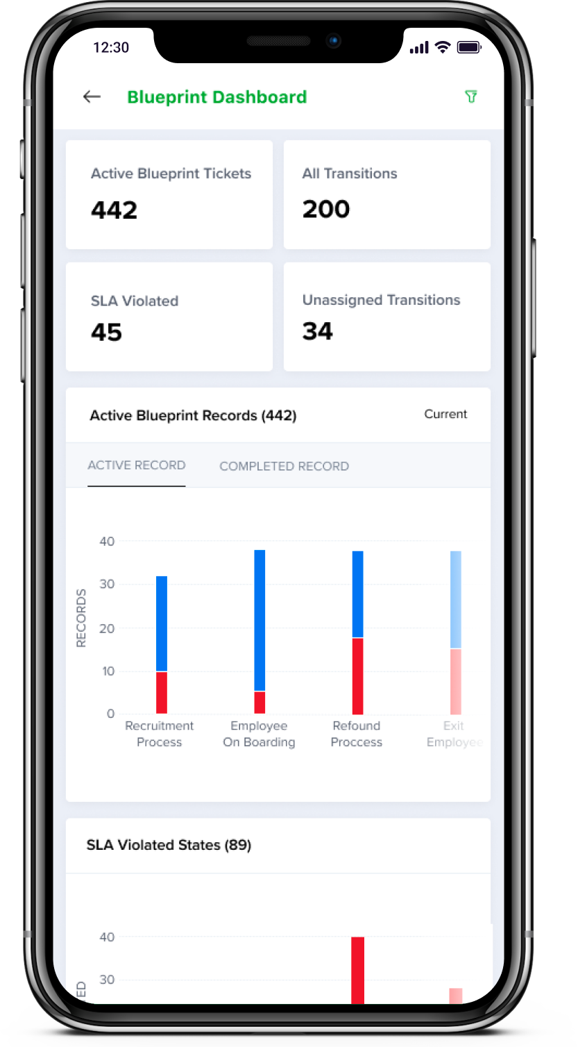 Active Blueprint tickets | A multi graph representation of the number of tickets that currently have a blueprint applied and the number of tickets that have violated a state-level SLA. | Monitor and evaluate process adherence. |