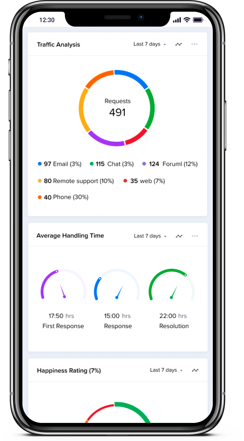 Average Handling Time | First response time, average response times, and resolution time each represented separately using meter graphs. | Evaluate the quality and efficiency of your service. |