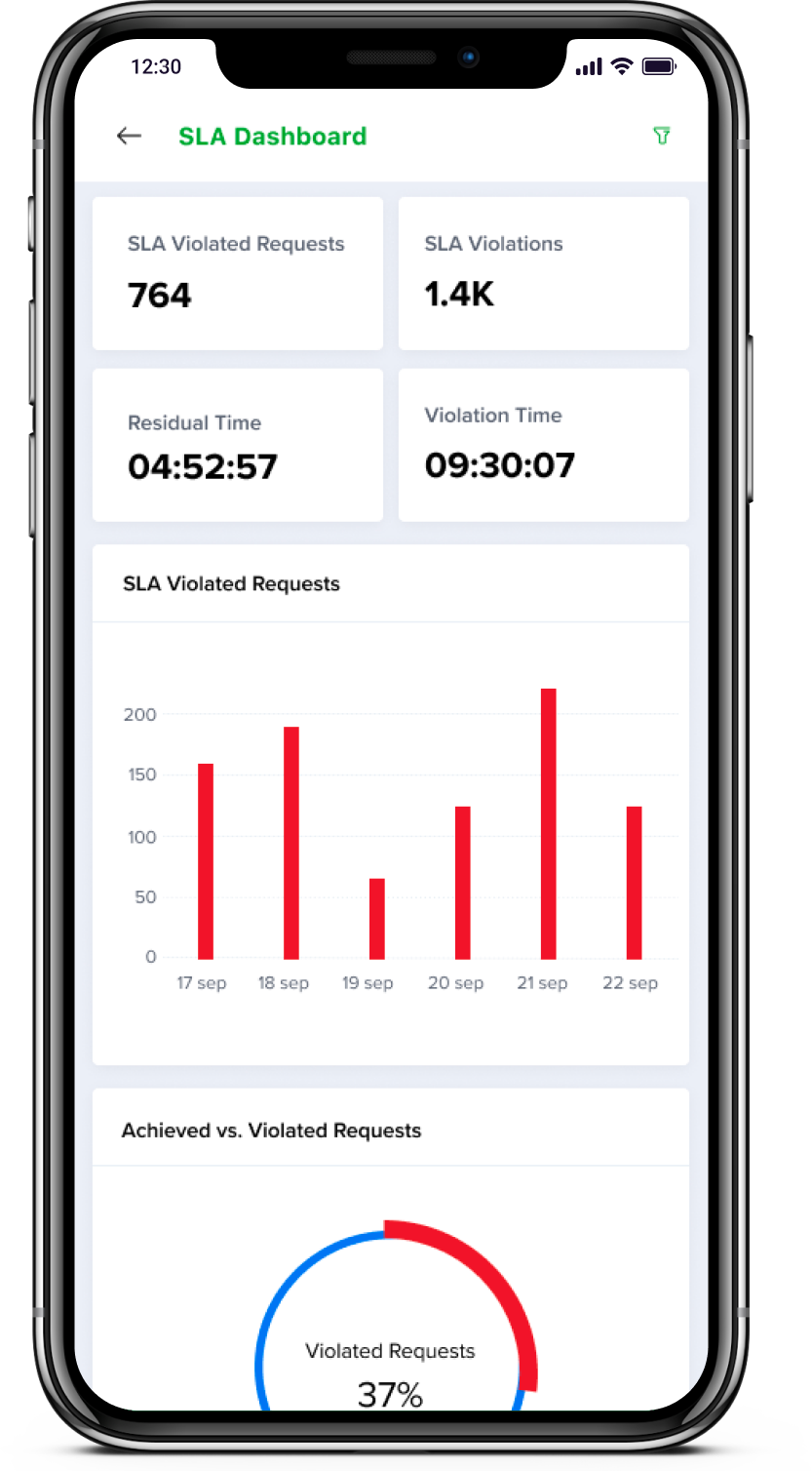 SLA violated tickets | A bar chart that displays the number of request that breached SLA targets over a period of time. | Identify complex tickets that require a significant amount of time to solve. |
