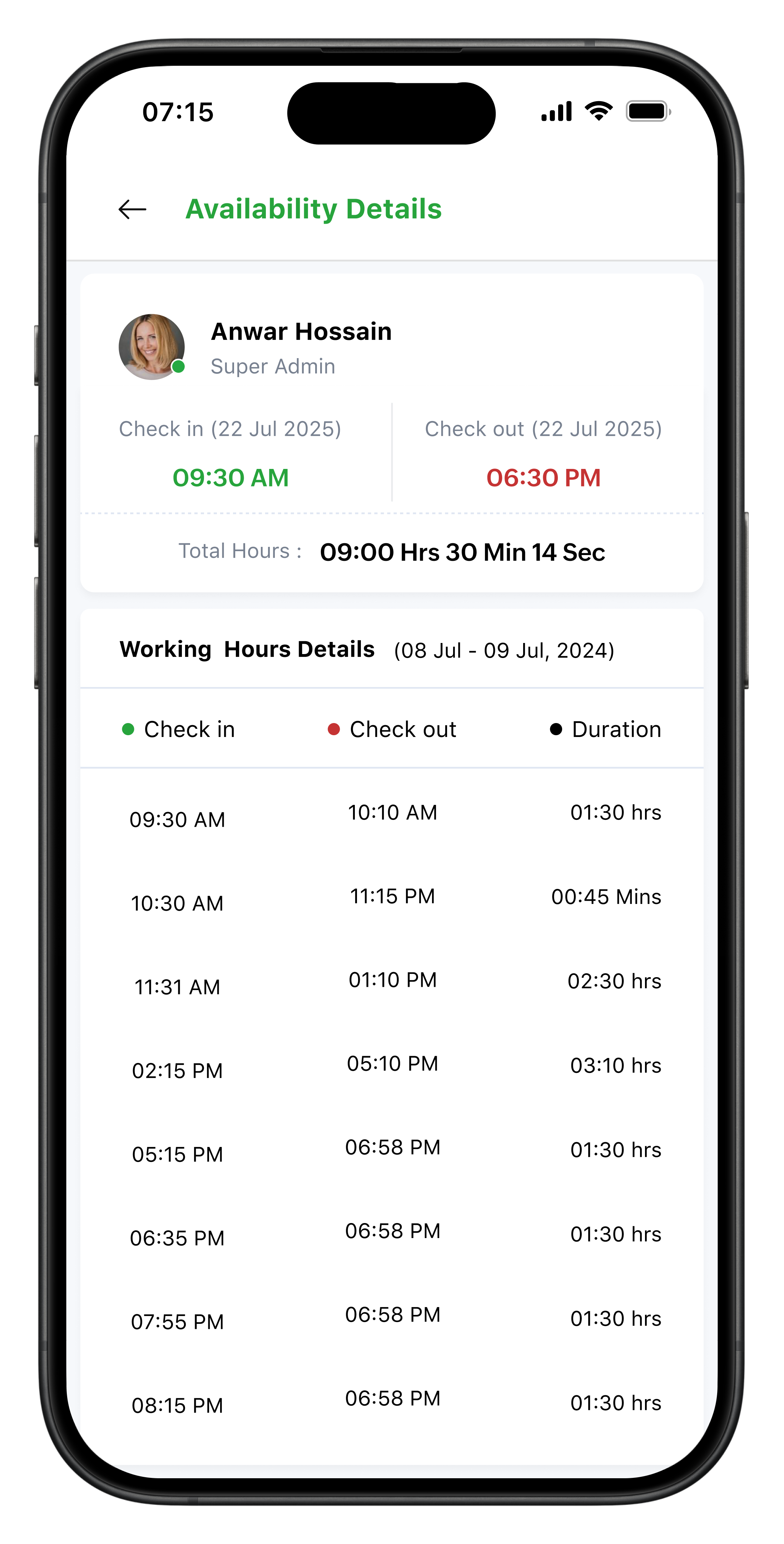 Summary view: In this view, the log-in and log-out columns show the first check-in time and last check-out time, respectively. So each entry (each row) corresponds to one shift.