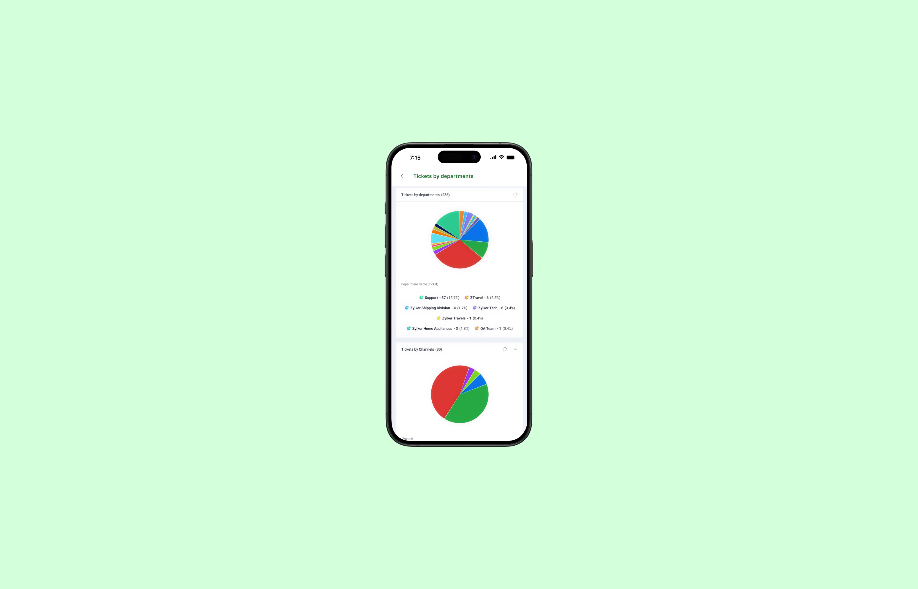 This dashboard visualizes the ticket distribution across departments, showing how many tickets each department handles in a given period.