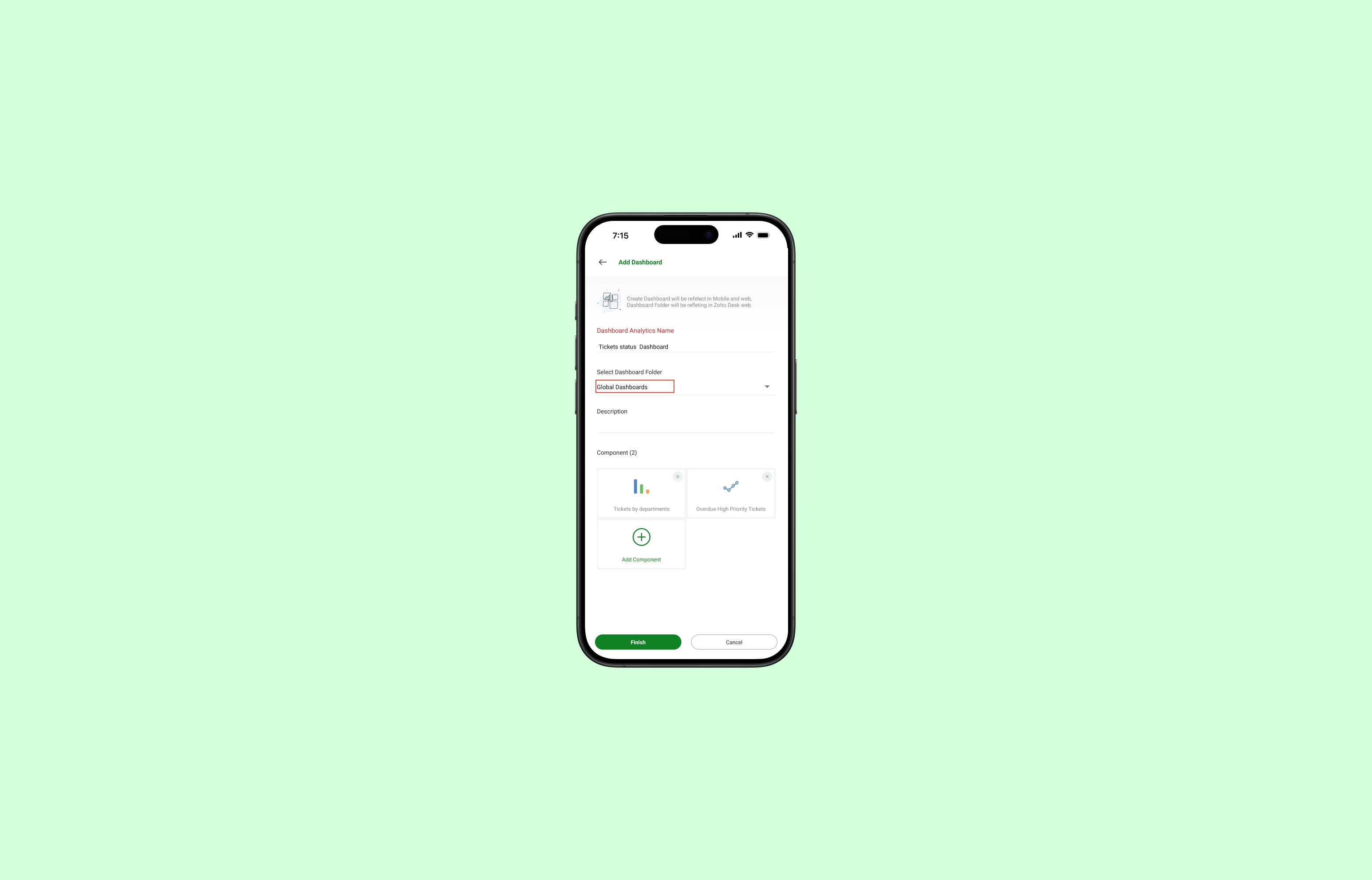 - Select the Global Dashboards folder. This step is crucial, as it tells the app to consolidate data from all departments for the dashboards. If another folder is selected, a department-level dashboard will be created instead of a global one.