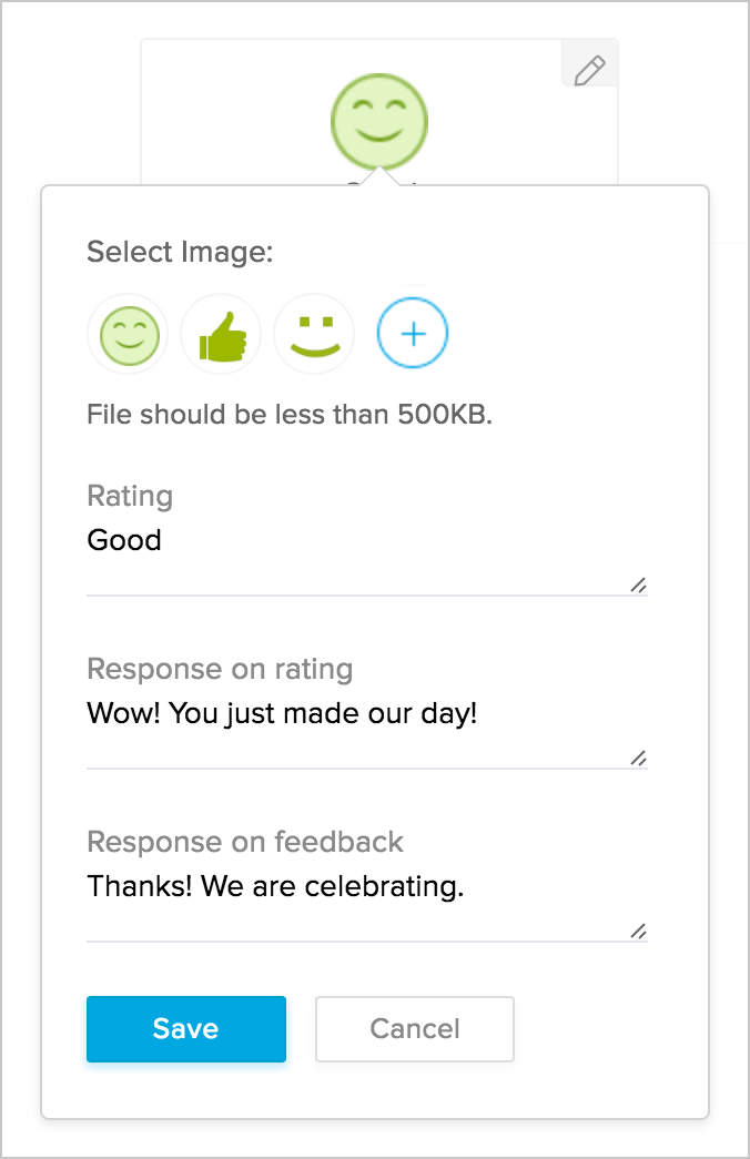 Personalize the default rating options provided in Zoho Desk. You can customize the smileys, rating text, and the response displayed after rating a ticket.