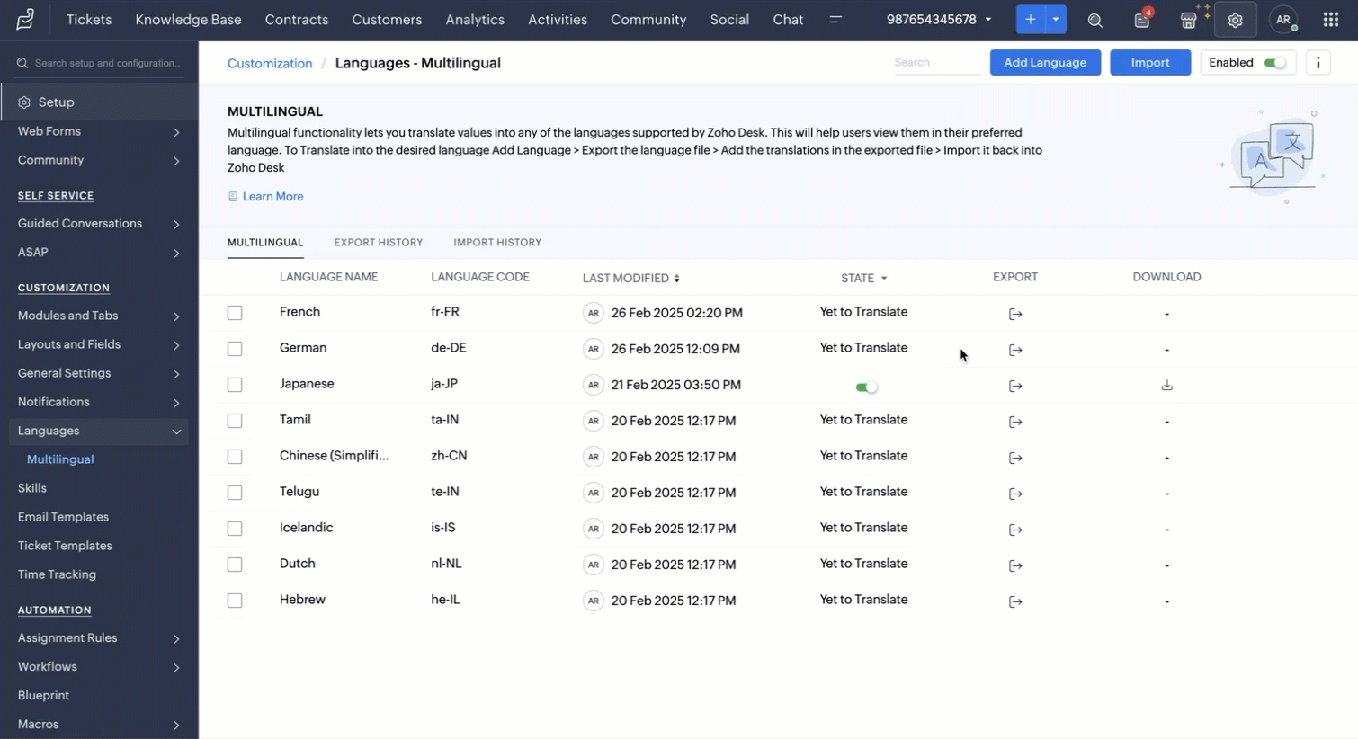 - Upload the translated file back to the Zoho Desk by clicking on Import button at the top of the Multilingual page.