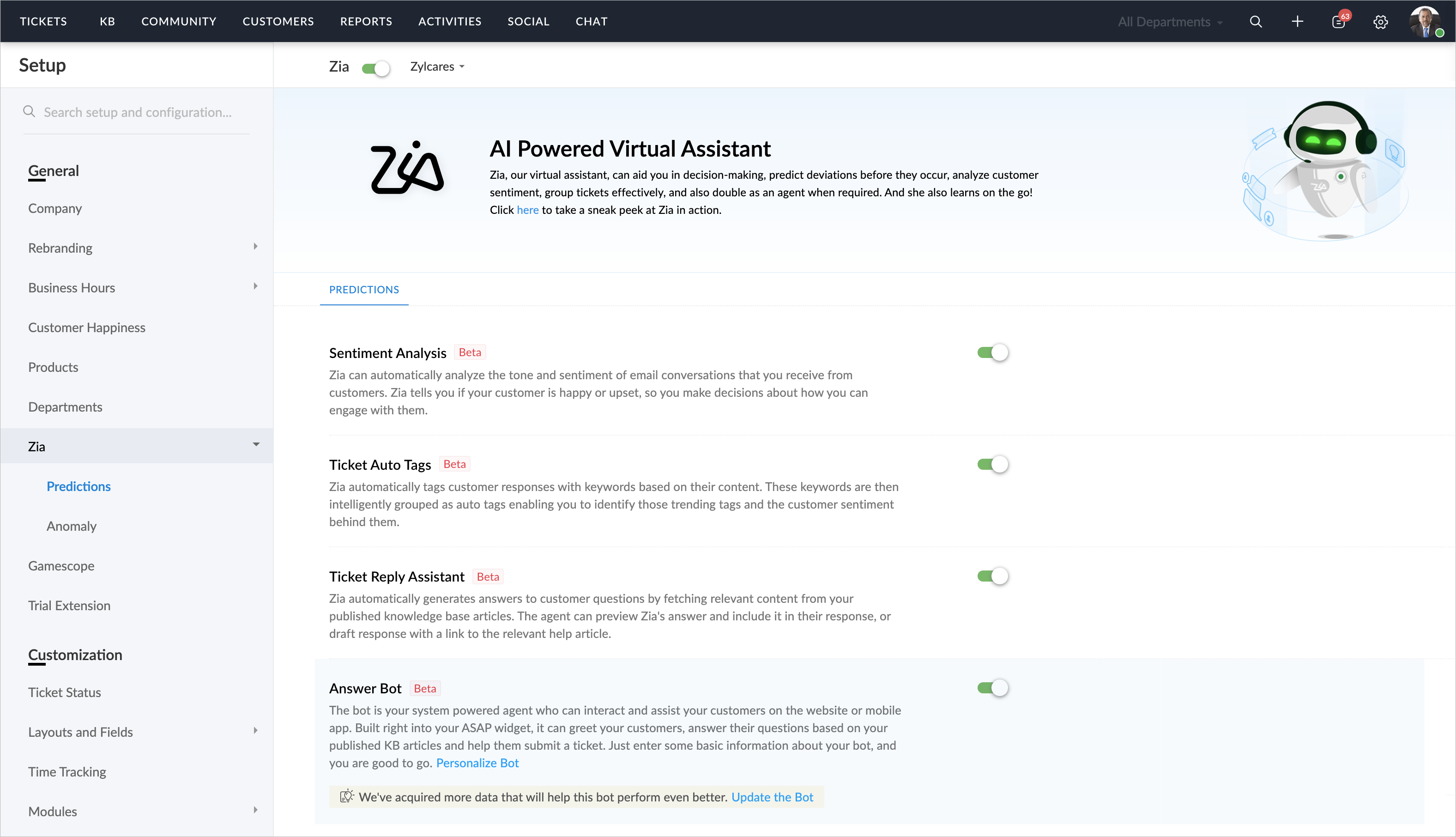 Enabling Zia Answer Bot for the Help Center