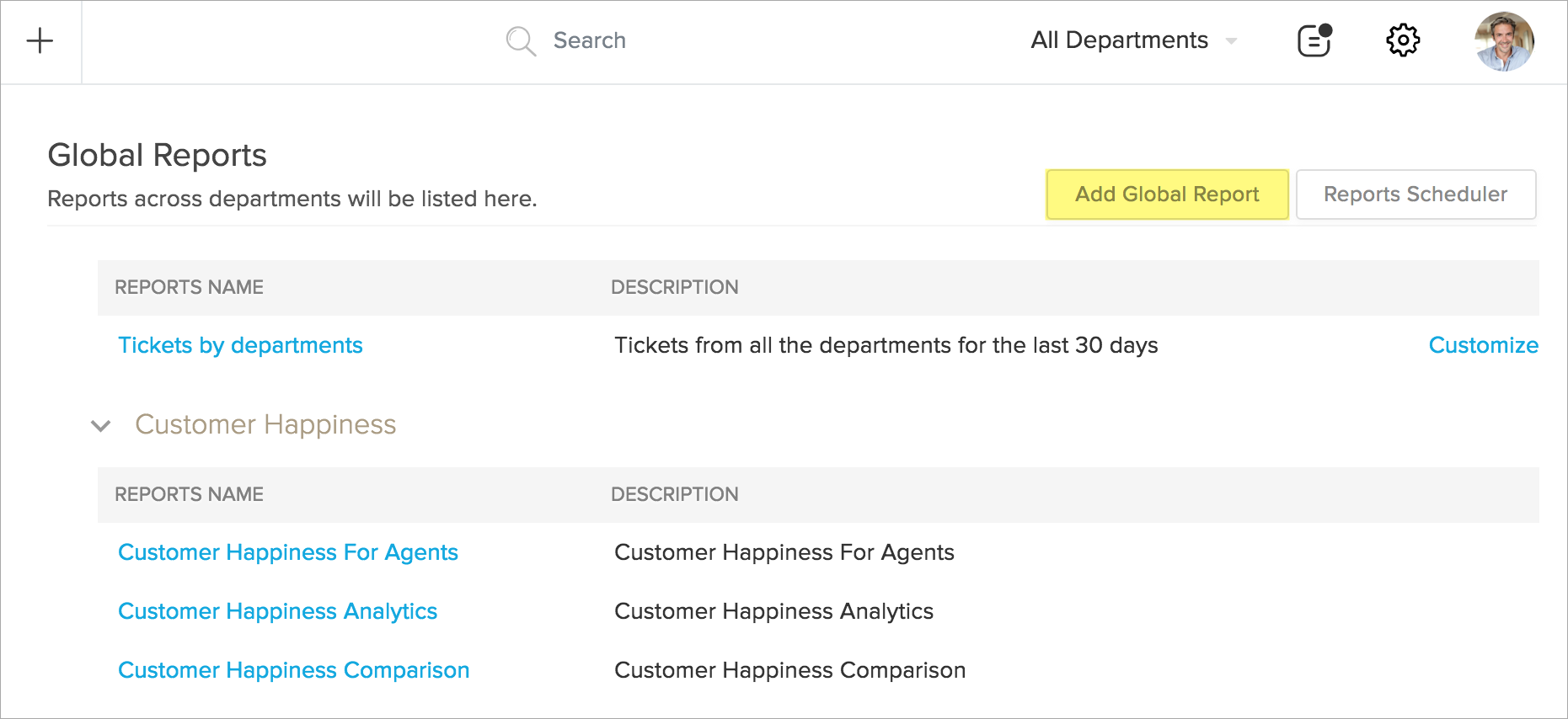 Global reports enable you to create a report for all of your departments in Zoho Desk. Unlike regular reports, the global reports will help you make informed decisions by providing a holistic view of the activities across departments. The procedure is almost the same as creating a regular report.