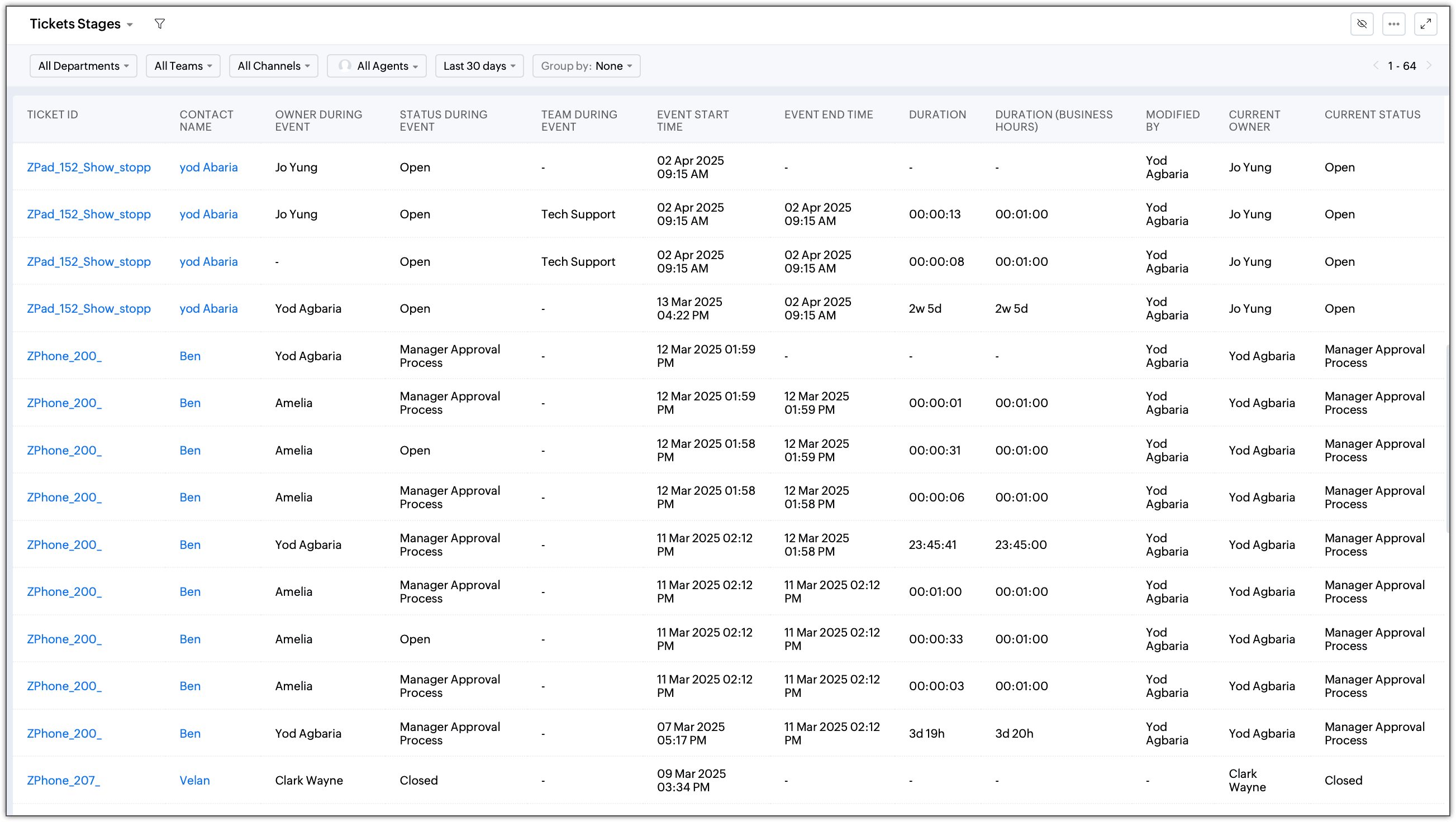 Similar to the Lifecycle report, the Ticket Stage Report provides a detailed view of each ticket's progress through its stages, helping managers track workflow, identify delays, and address bottlenecks. By analyzing time spent at each stage, managers can improve resource allocation, enhance the workflow, and make informed decisions to ensure a more efficient and transparent process.