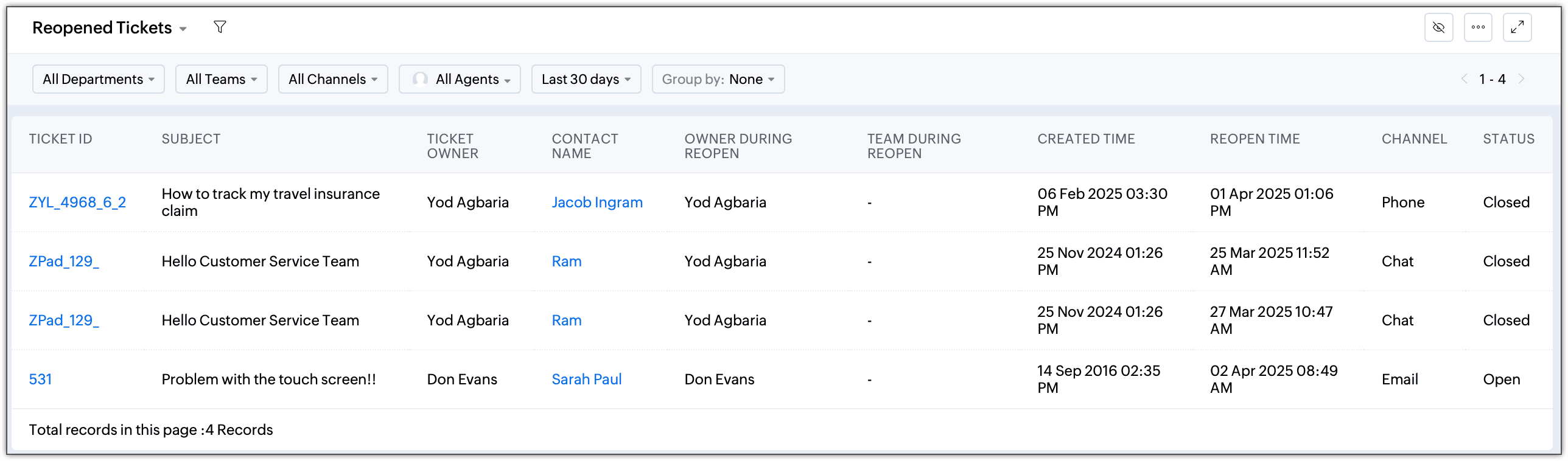 This reopened tickets report can help managers and teams identify patterns, recurring issues, or gaps in the resolution process. By analyzing each ticket, they can identify the areas for improvement to enhance customer experience so that they do not receive recurring similar tickets. For example, they could add tags to these tickets to identify similar issues, or simply create an assignment rule to filter our recurring issues.