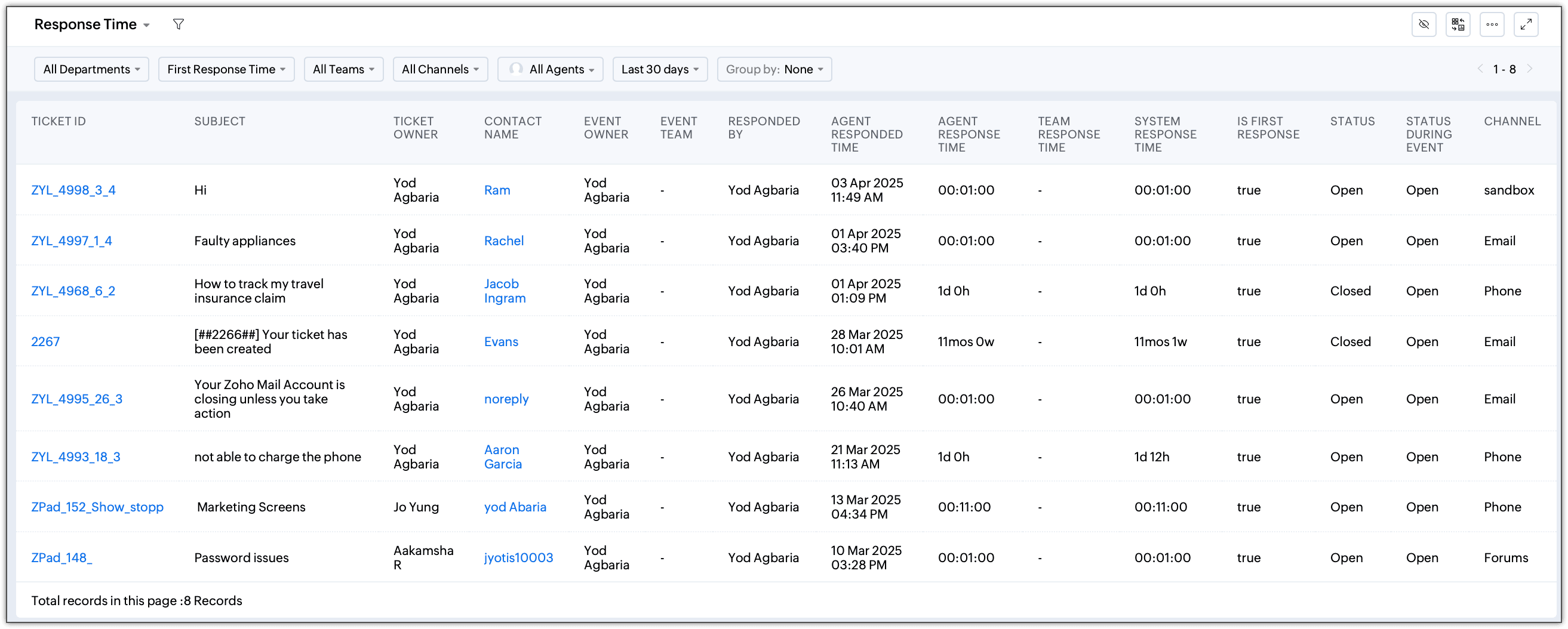 | This report can be filtered by Response time, first response time, channels, agents, duration, and can also be grouped by date, agent, channel, and request.
