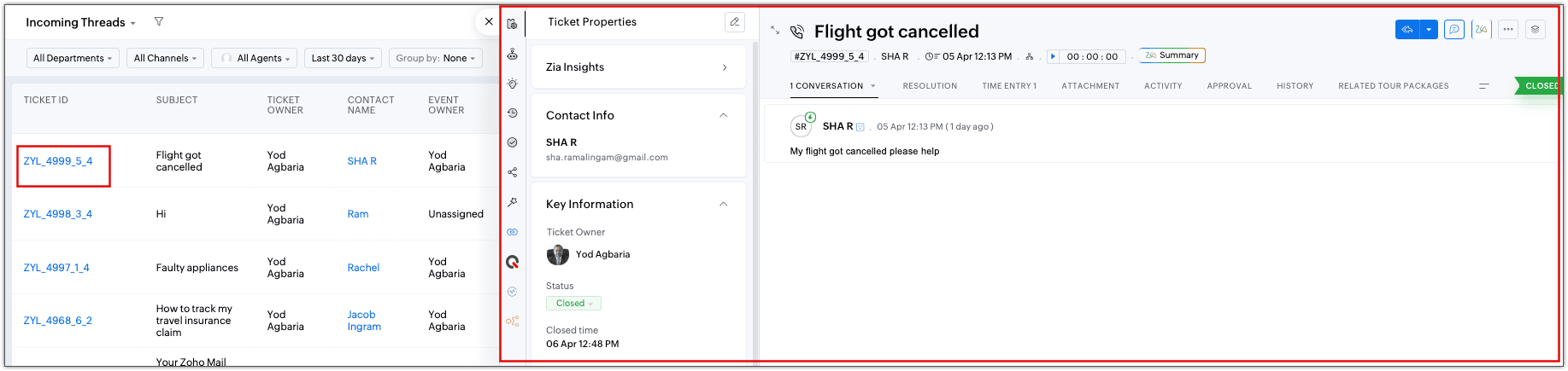Click the request ID to view the ticket details, and click the contact name to view the details of the contact who raised the query.
