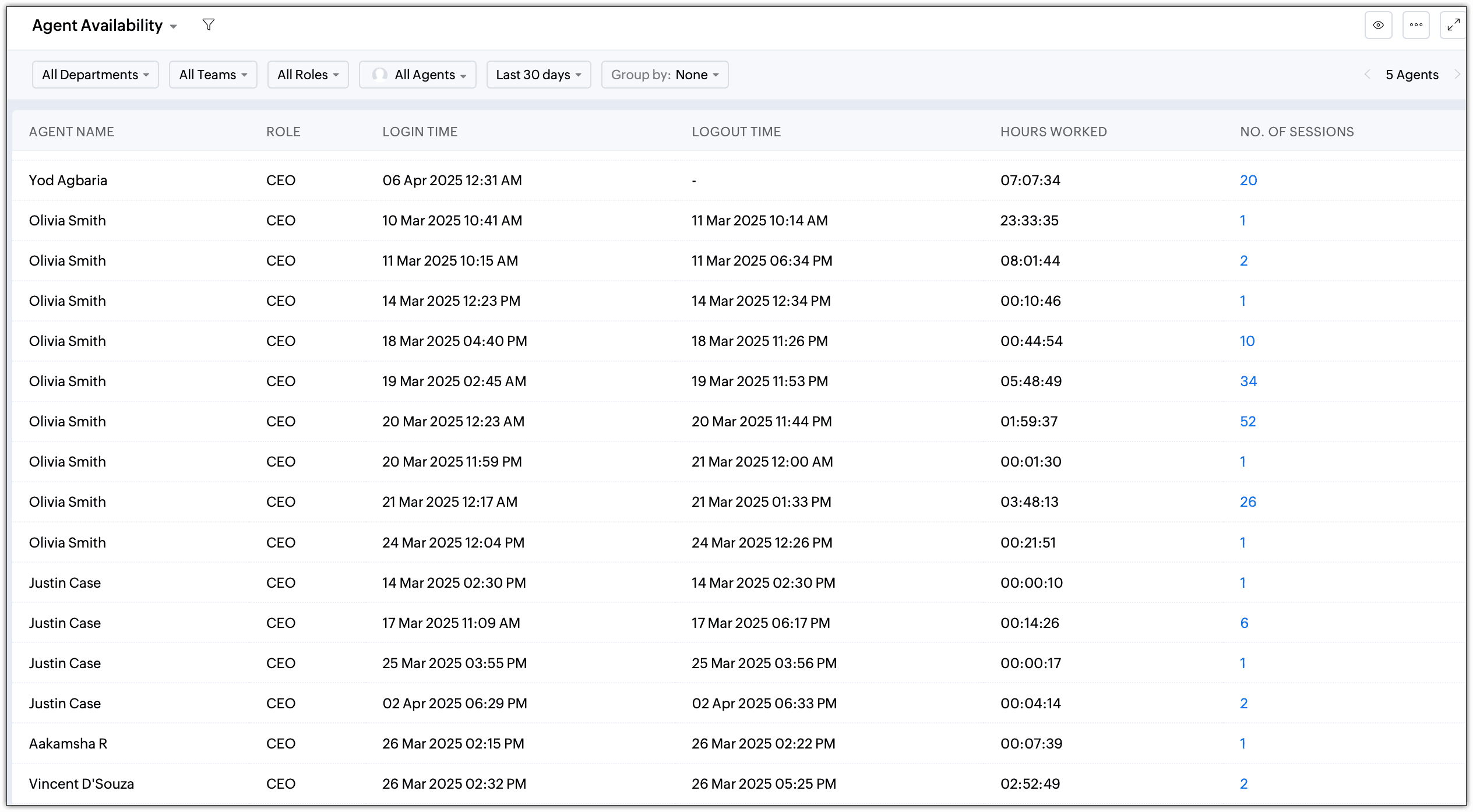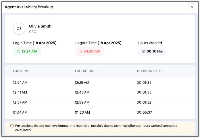 Clicking on the number of sessions will provide a detailed view of the login and logout time of the agent.