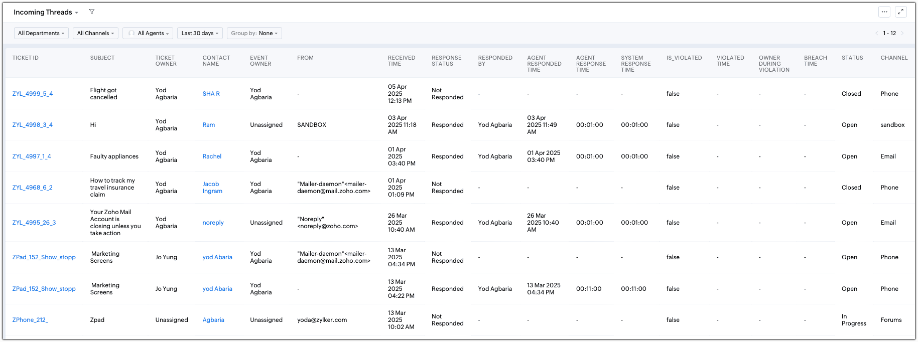In an organization, there will be multiple sources, such as email, chats, and tickets, through which the customer posts their query. If a manager wants to track the number of queries received on a particular day from a particular channel, then the Incoming Threads report can be used. It helps the manager to assign agents based on the volume of tickets received in each channel. For example, if there are multiple tickets coming in via WhatsApp and not by email, then the manager can reallocate a few agents from the email team to handle whatsapp queries. This will ensure that the customer queries are handled promptly.