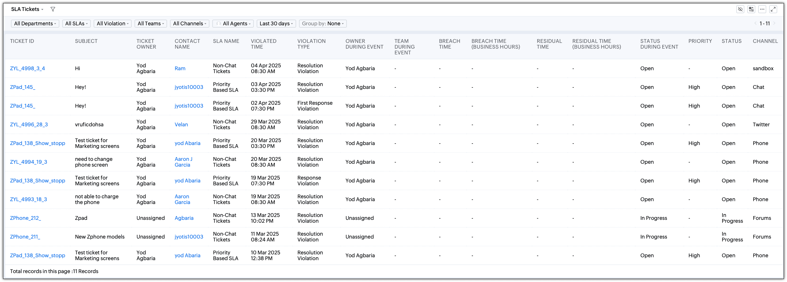 The SLA ticket report will highlight the SLAs that were violated, the violation type, and time taken to respond after SLA elapsed.