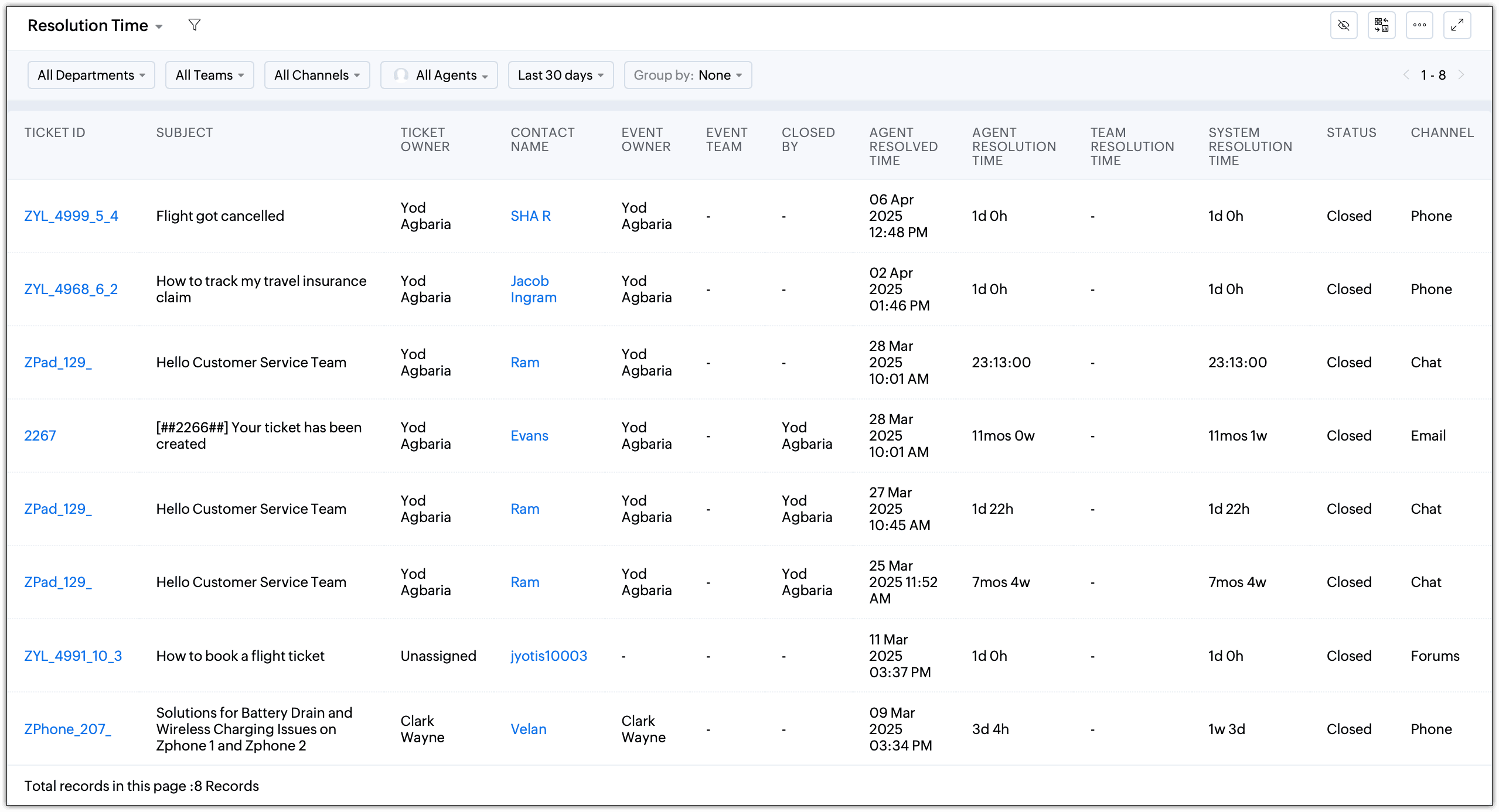 The ultimate purpose of the resolution time report is to measure and track the time the agents take to resolve tickets from the time it was created until they are closed.