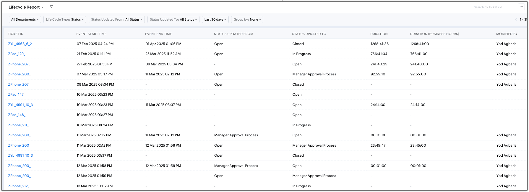 | This report can be filtered by department, lifecycle type, status updated from, status updated to, duration, and can also be grouped by ticket id, status updated from, and status updated to.