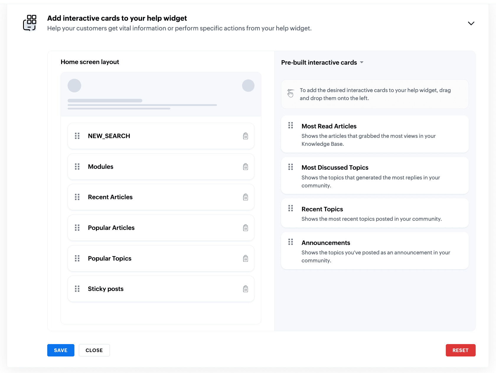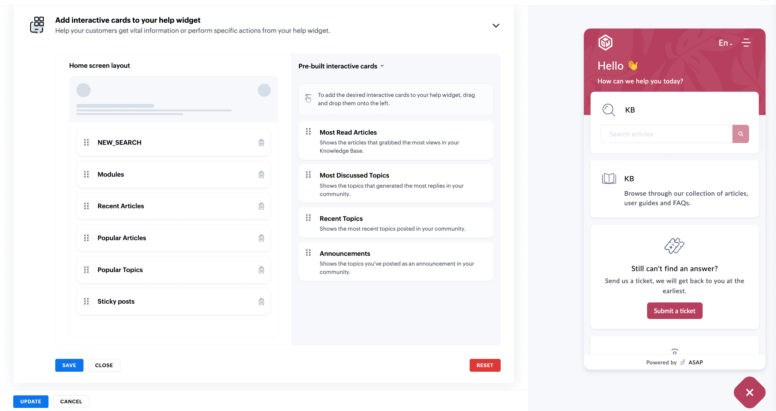 Interactive cards (default widgets) are a great way to add specific snippets of information. You can personalize the home screen of your ASAP help widget by including default widgets, such as knowledge base, community, tickets, and other functional modules. This makes it easier for your customers to quickly access relevant information about their orders. Furthermore, you can create custom widgets to suit your specific needs. For example, you can construct a widget called "Payment Details" and incorporate it into your home screen.