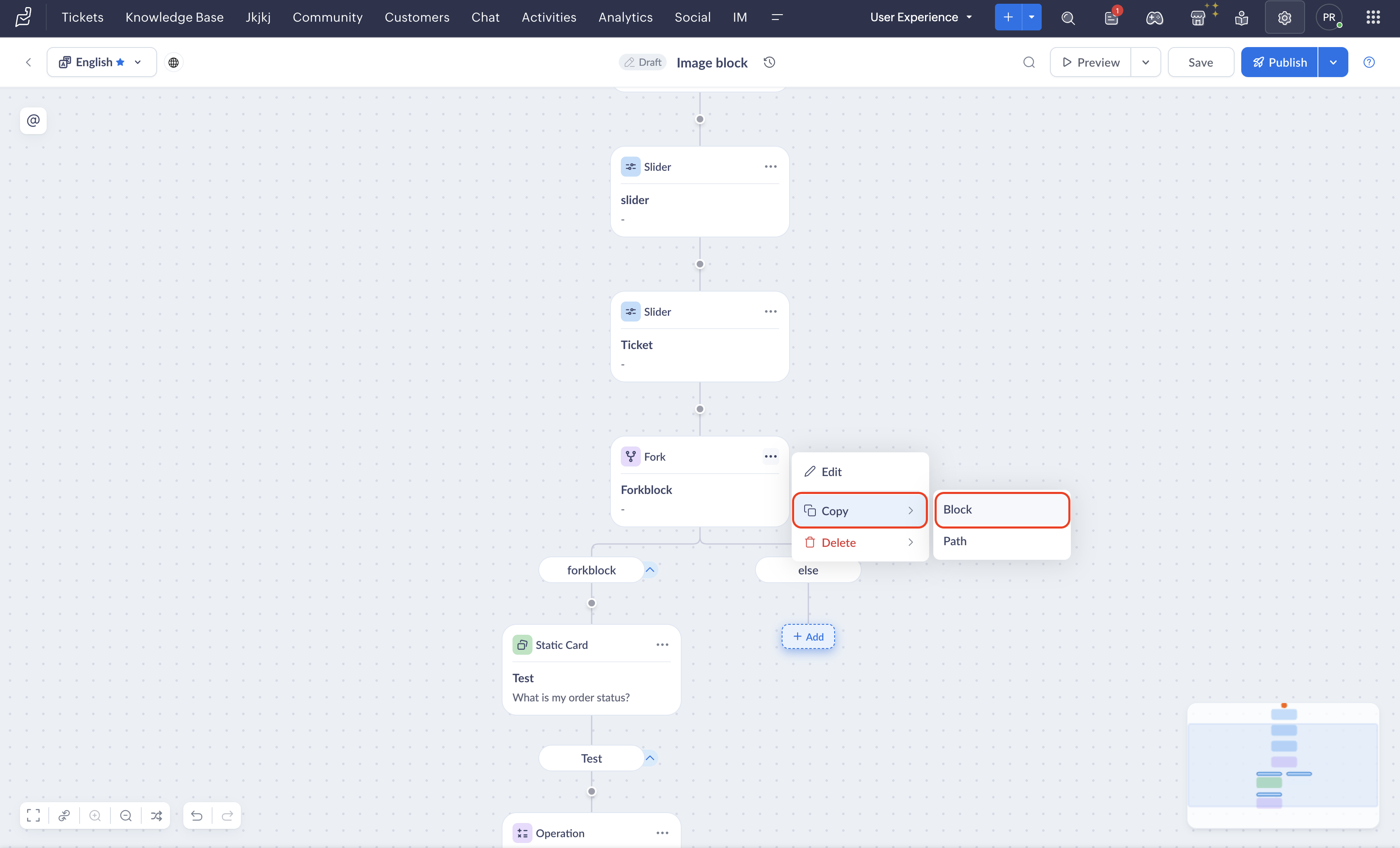 - When copying an existing fork block, all of its content, including any variables, will be copied as is. You can edit it as needed before adding it to the flow. Since the names of each block must be unique, the word '_copy' will be added to the copied blocks automatically; this can be changed if required.