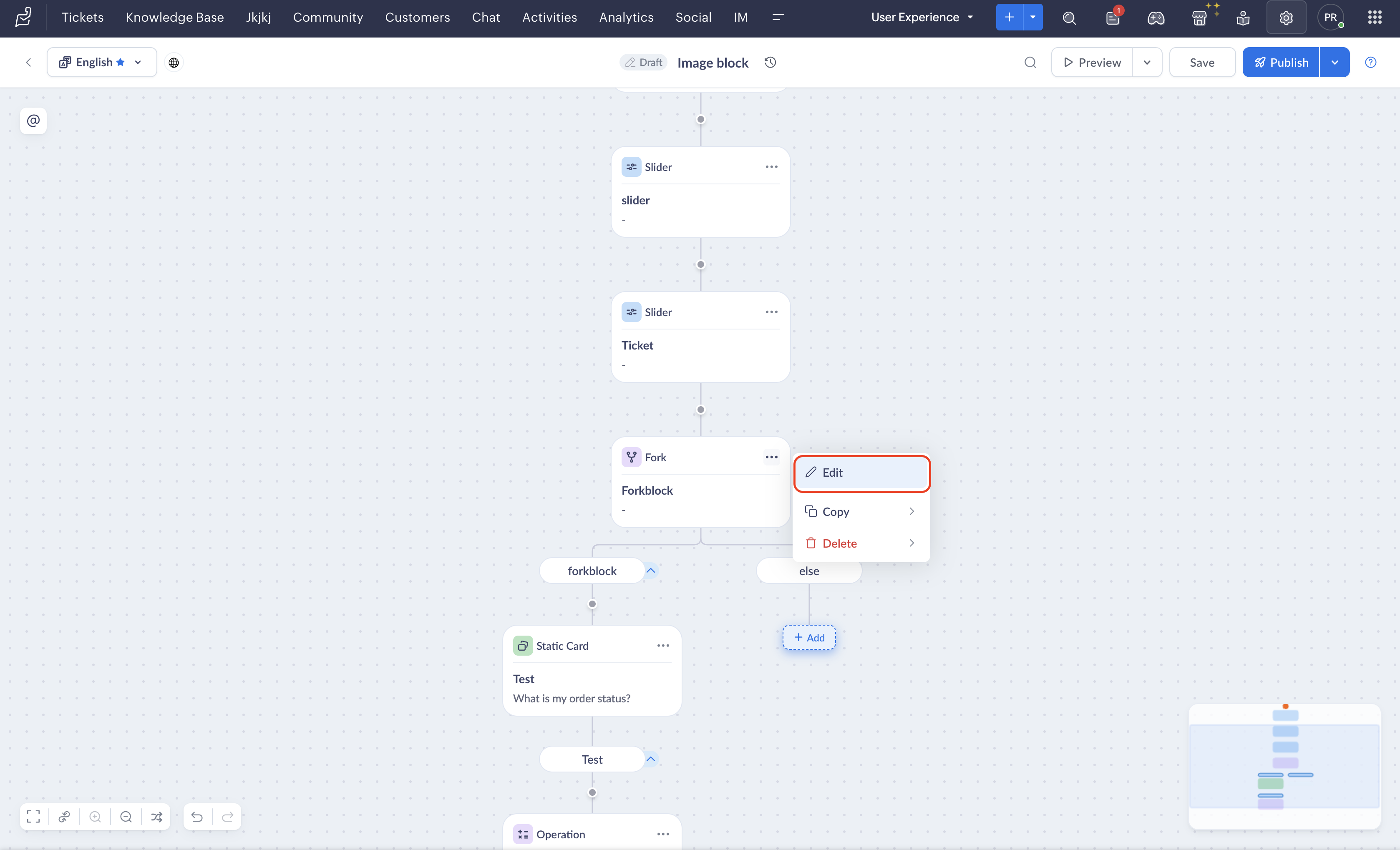 - If you delete a fork block while an end user is engaged in a live session with the bot, the previous version of the flow will be rendered until they restart the conversation.