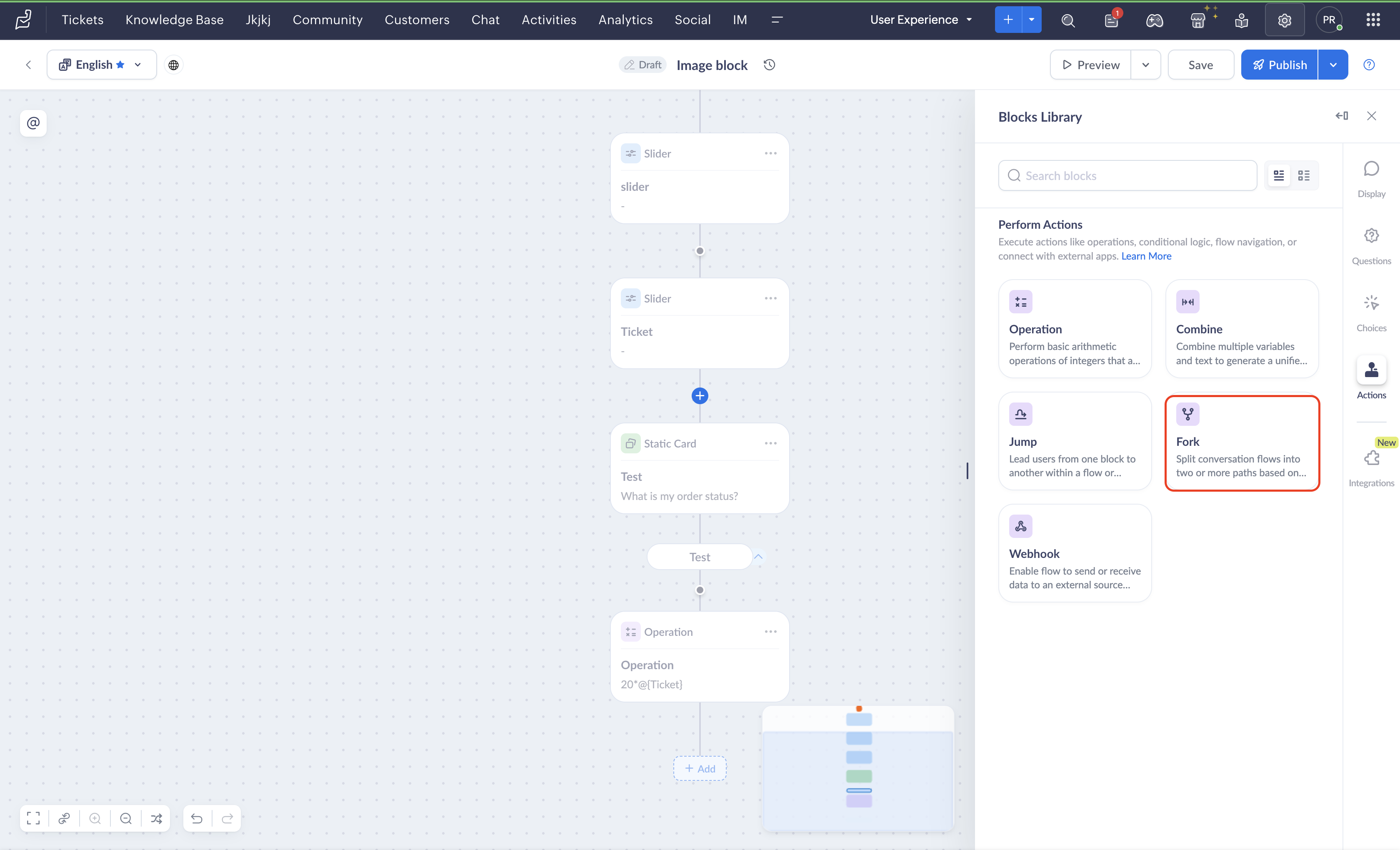 A fork block splits the conversation flow into two or more paths based on predefined conditions. The customer input received via a block is stored under a placeholder called "Block variables."