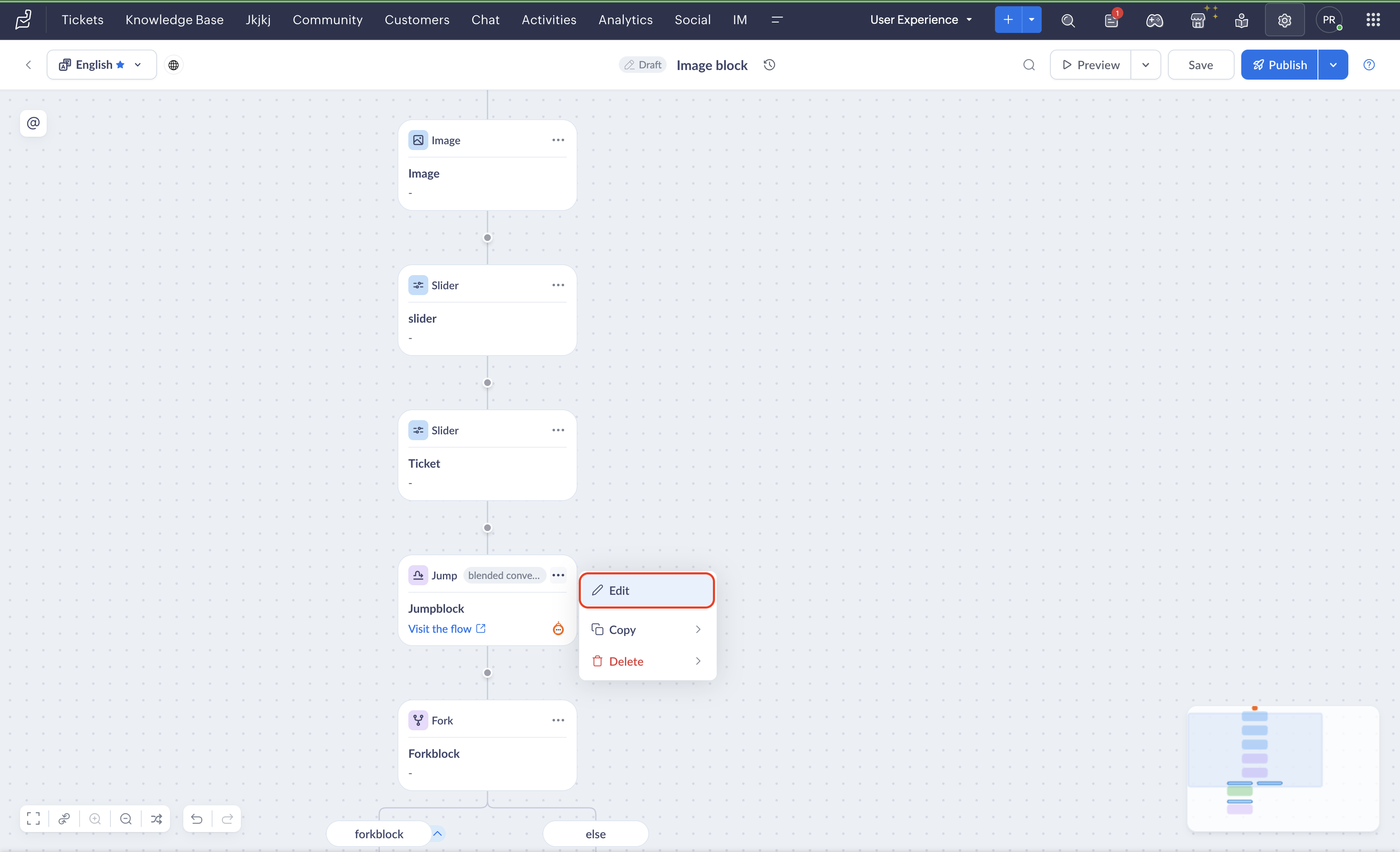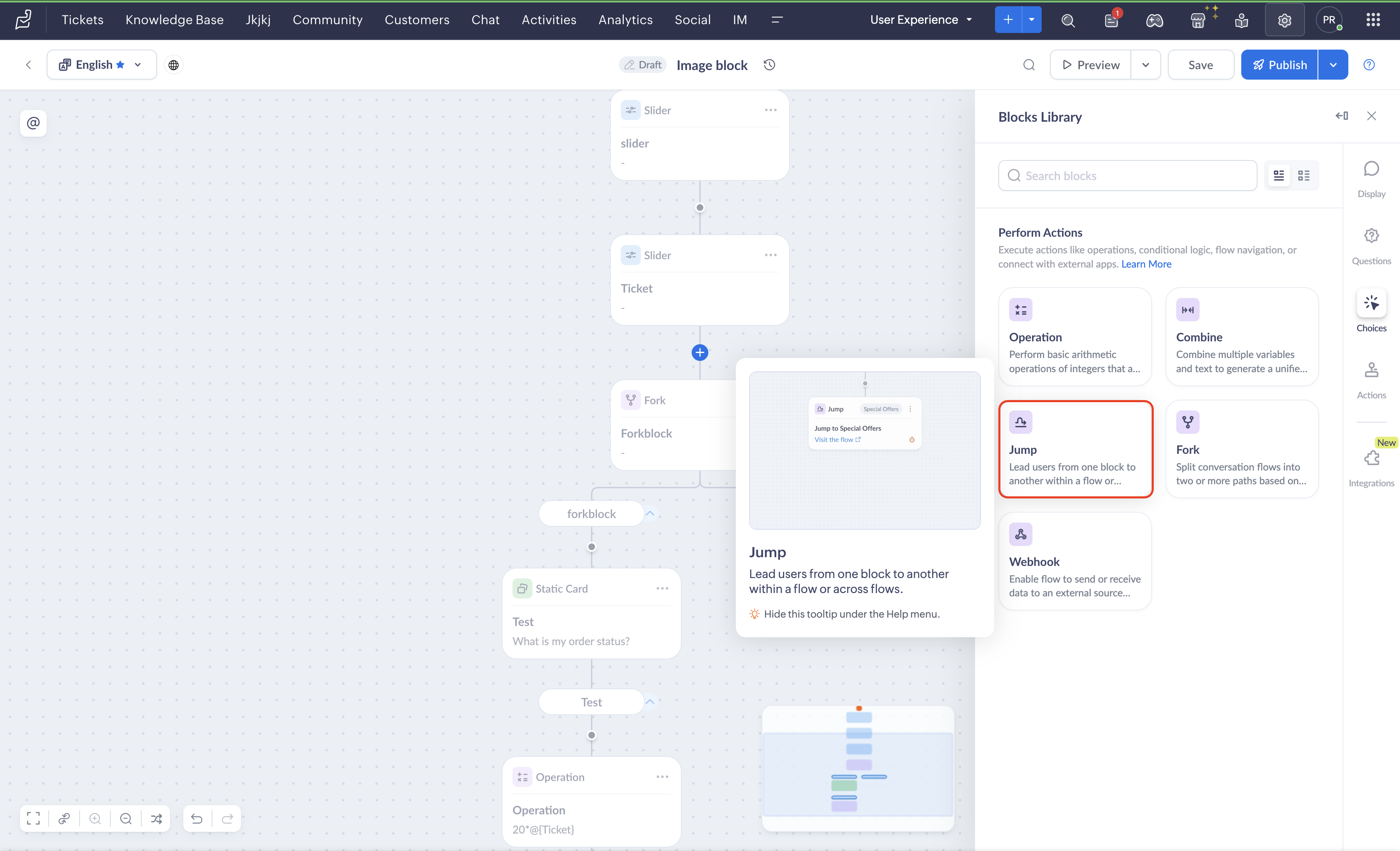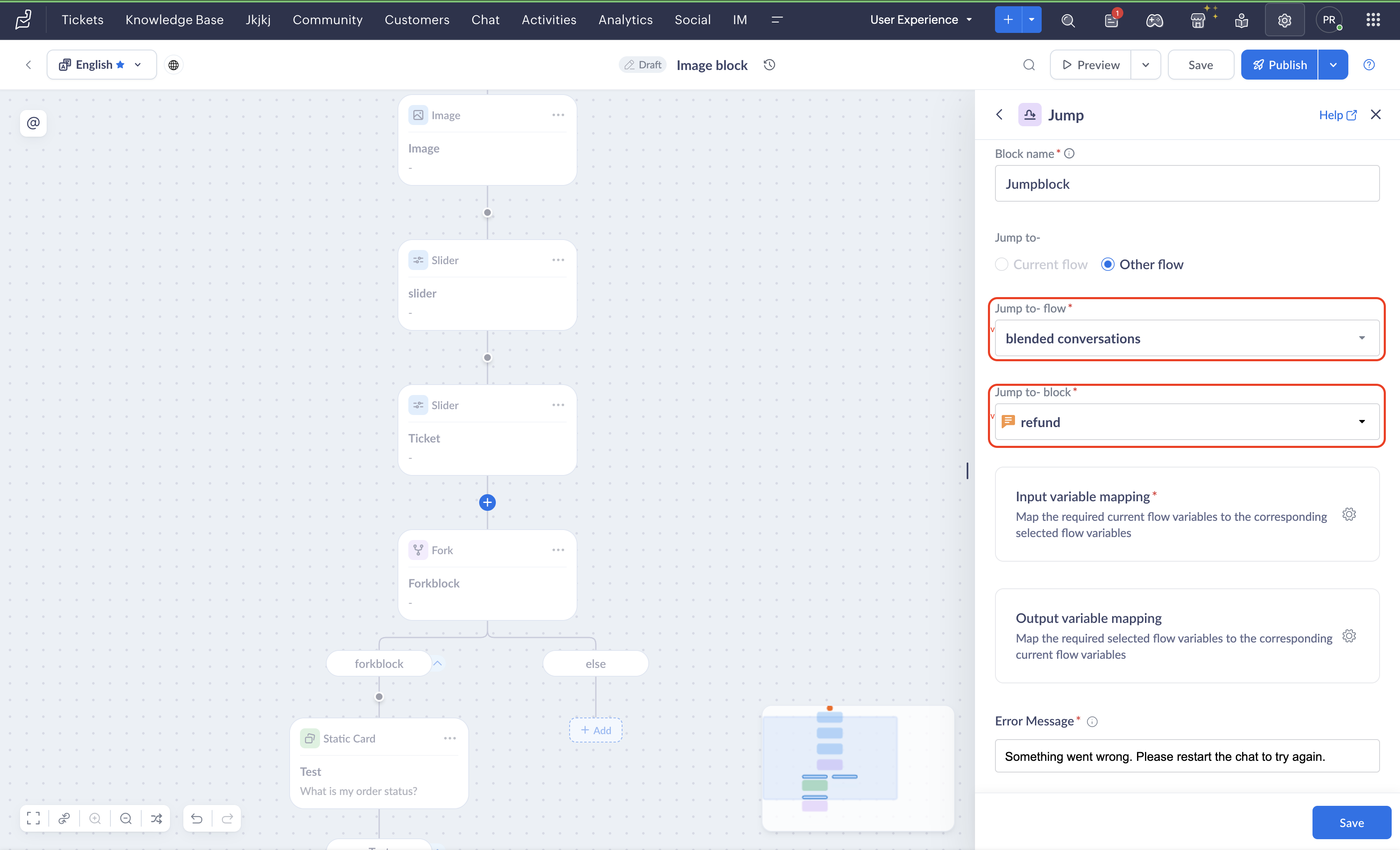 - If you delete an jump block while an end user is engaged in a live session with the bot, the previous version of the flow will be rendered until they restart the conversation.