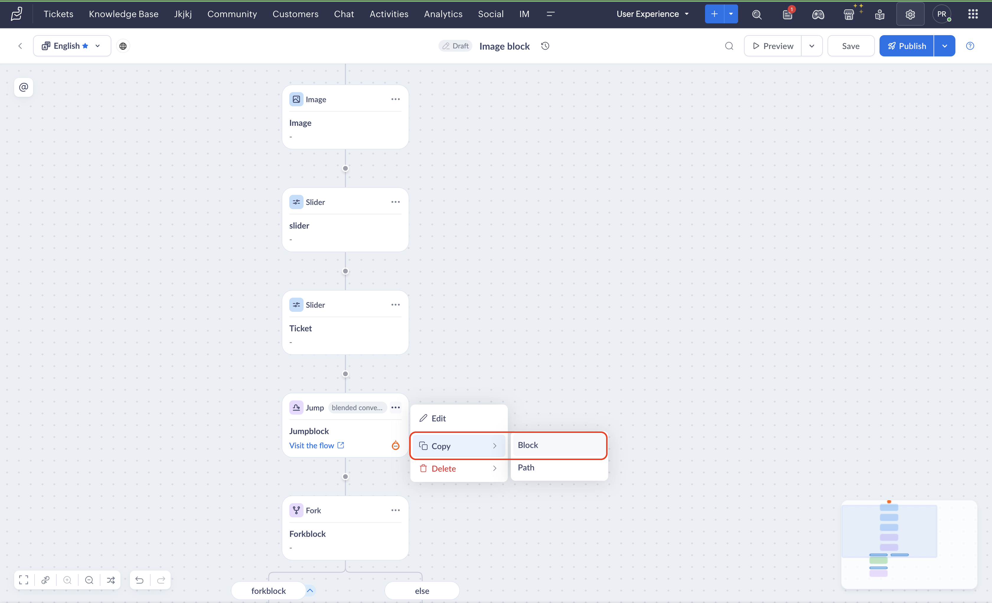 The copy block option can be used when you need to reuse a block that you previously created; you can copy that block and add it to your flow as it is or edit it according to the requirement.