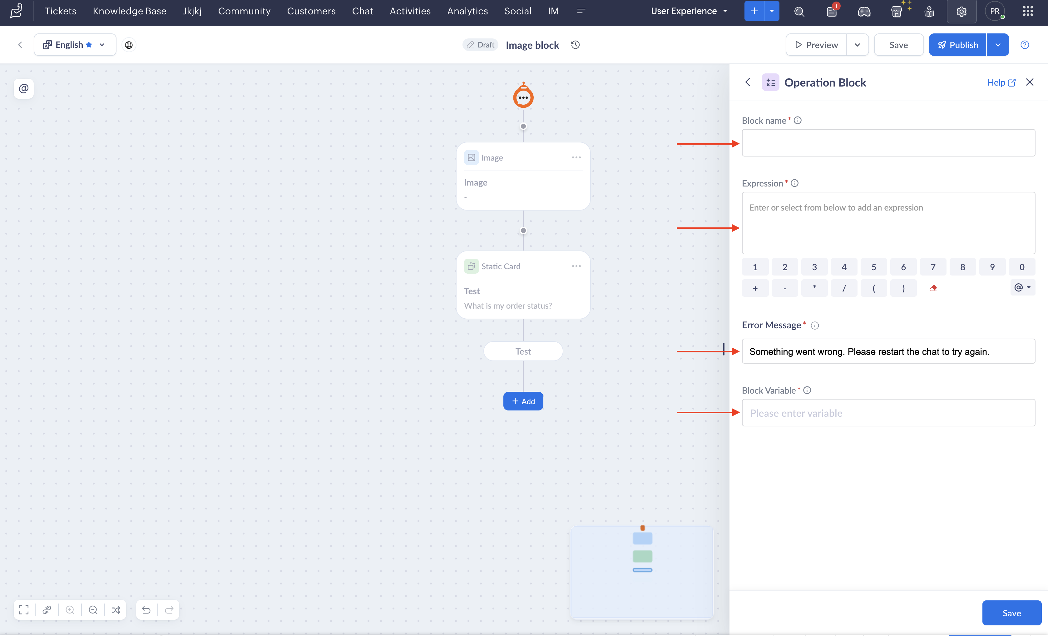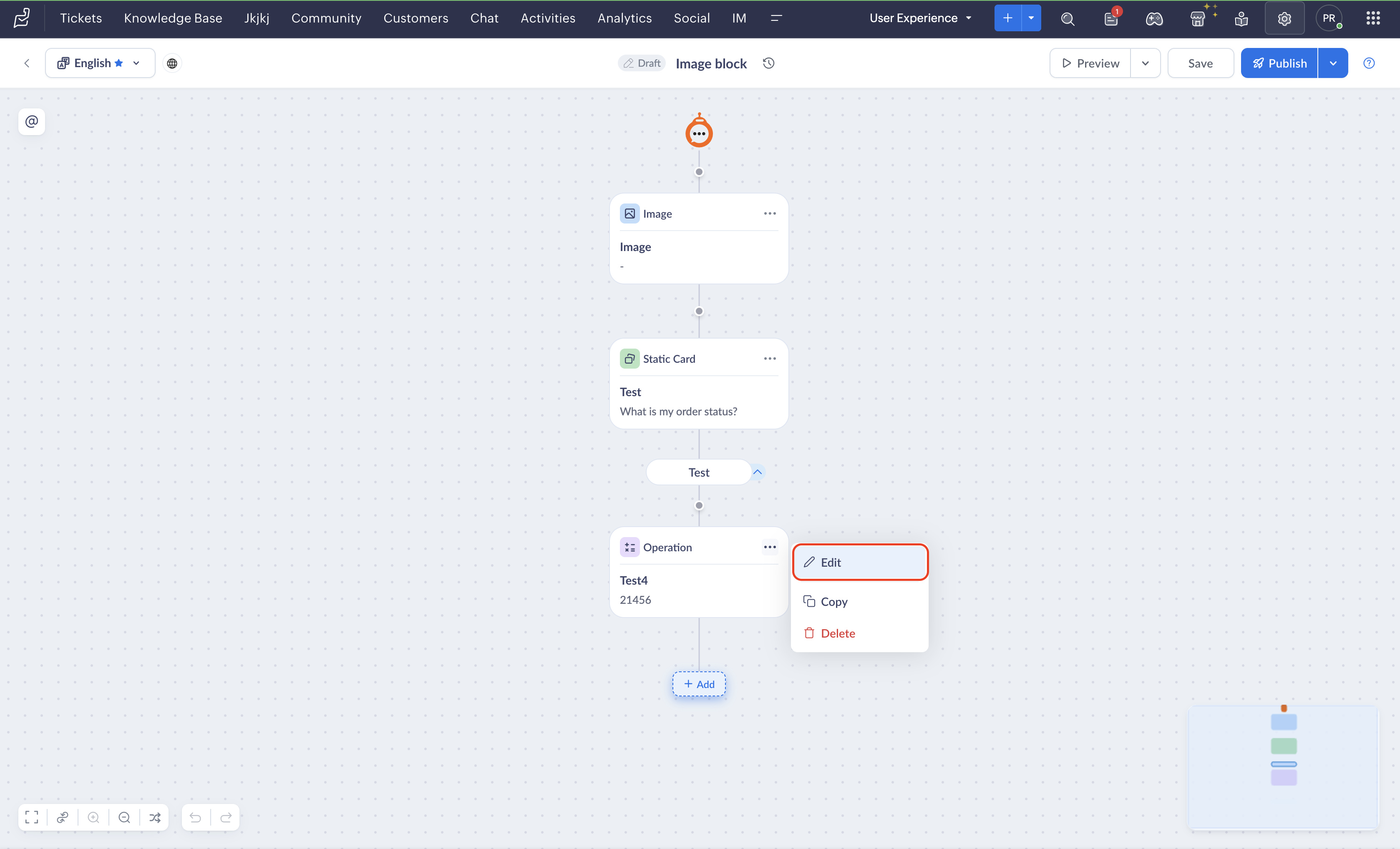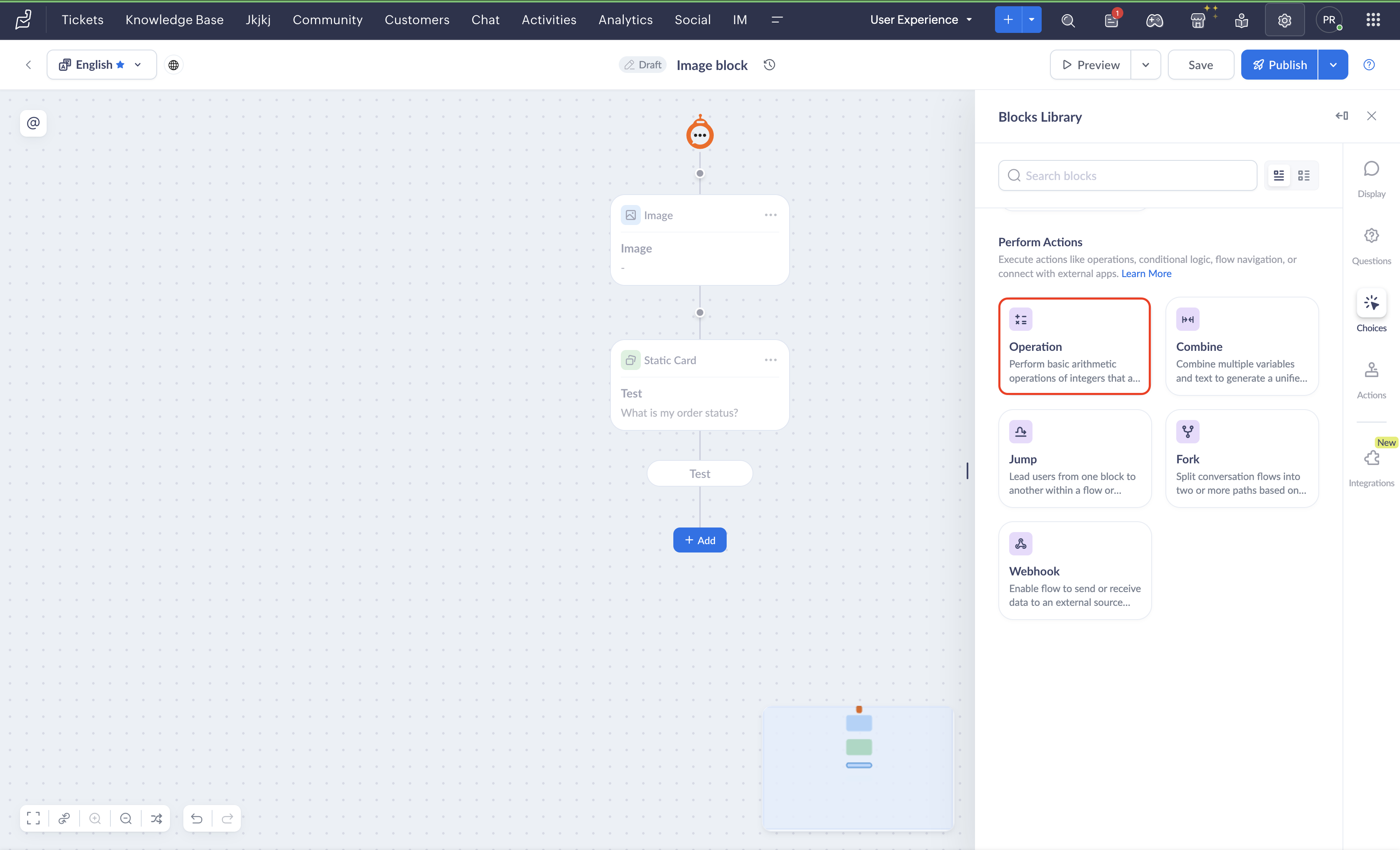 - If you delete an operation block while an end user is engaged in a live session with the bot, the previous version of the flow will be rendered until they restart the conversation.