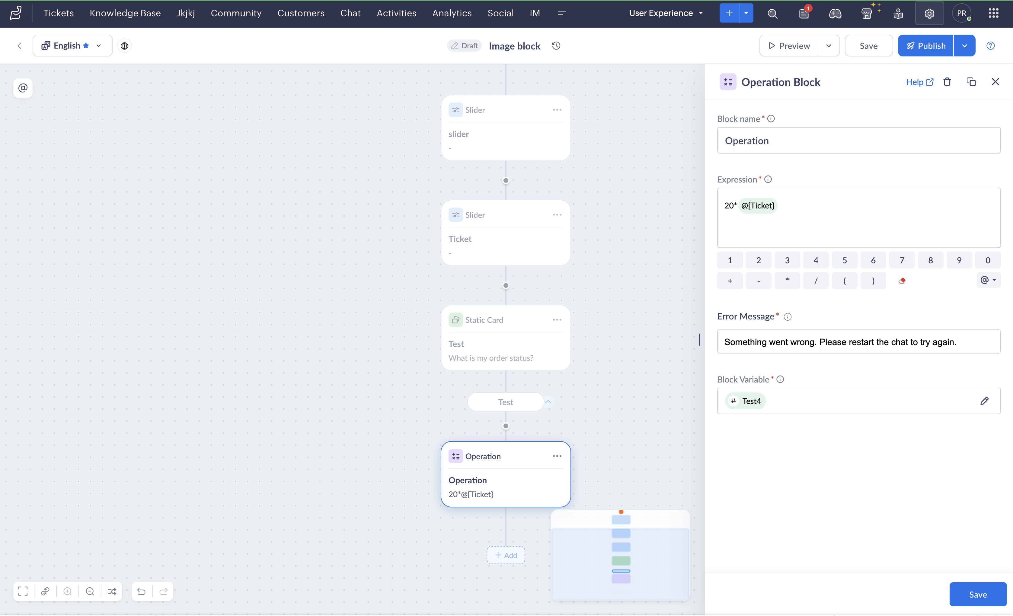 This block allows us to perform arithmetic operations and display the result during the chat session. Operation block can also be used to calculate the values retrieved from the block variable, local variable, and global variable.