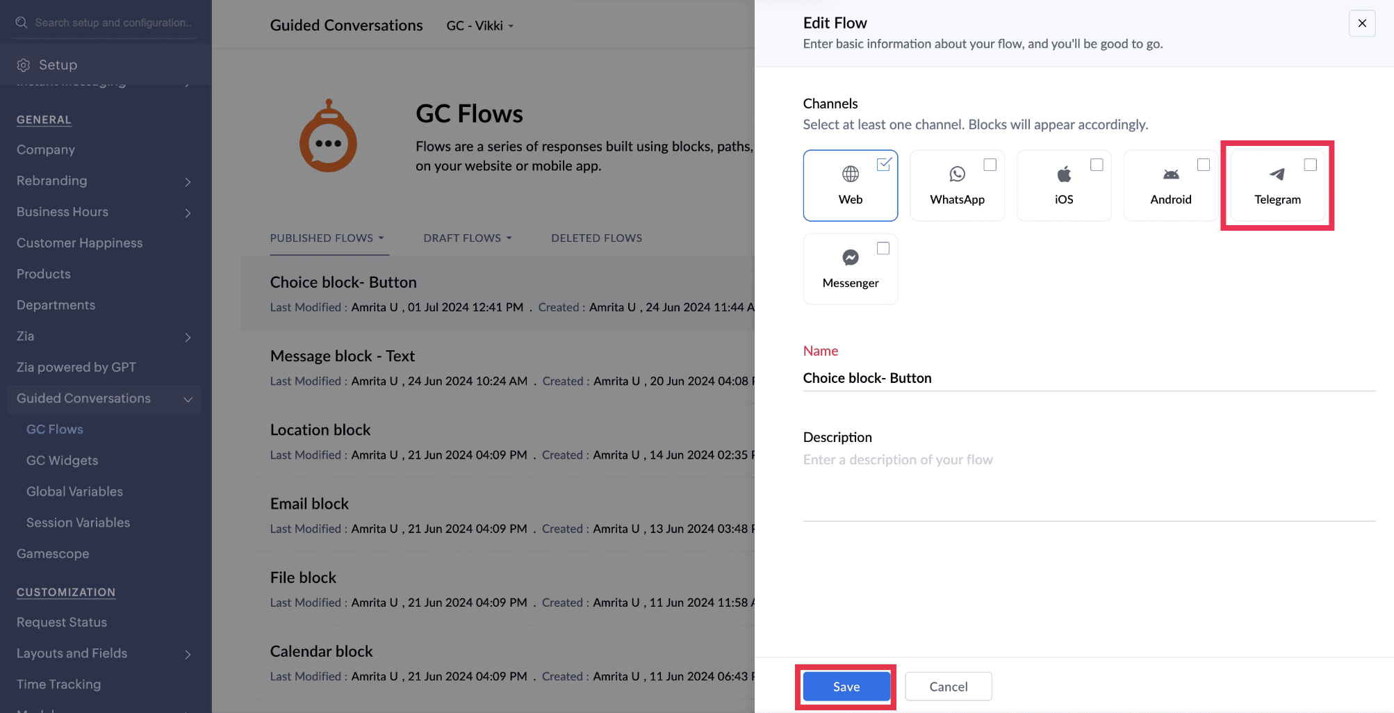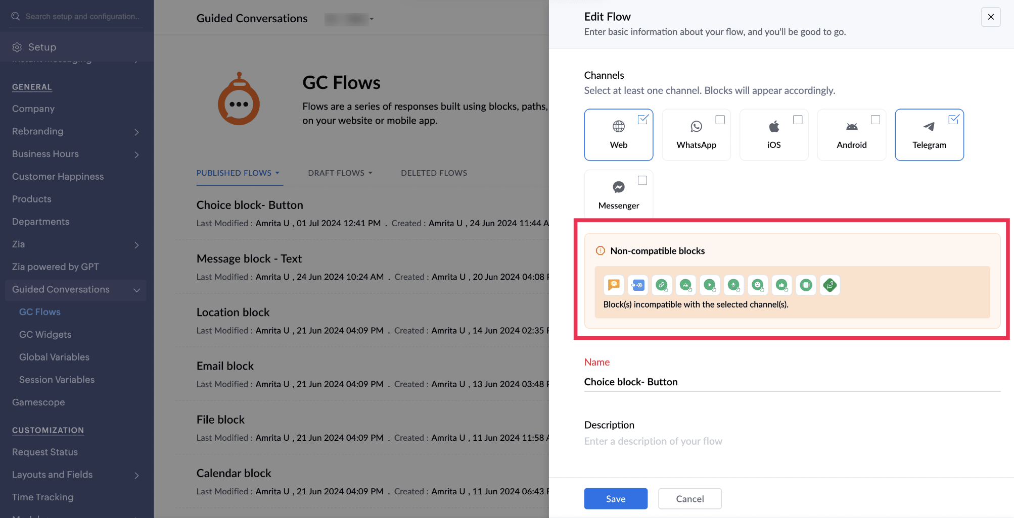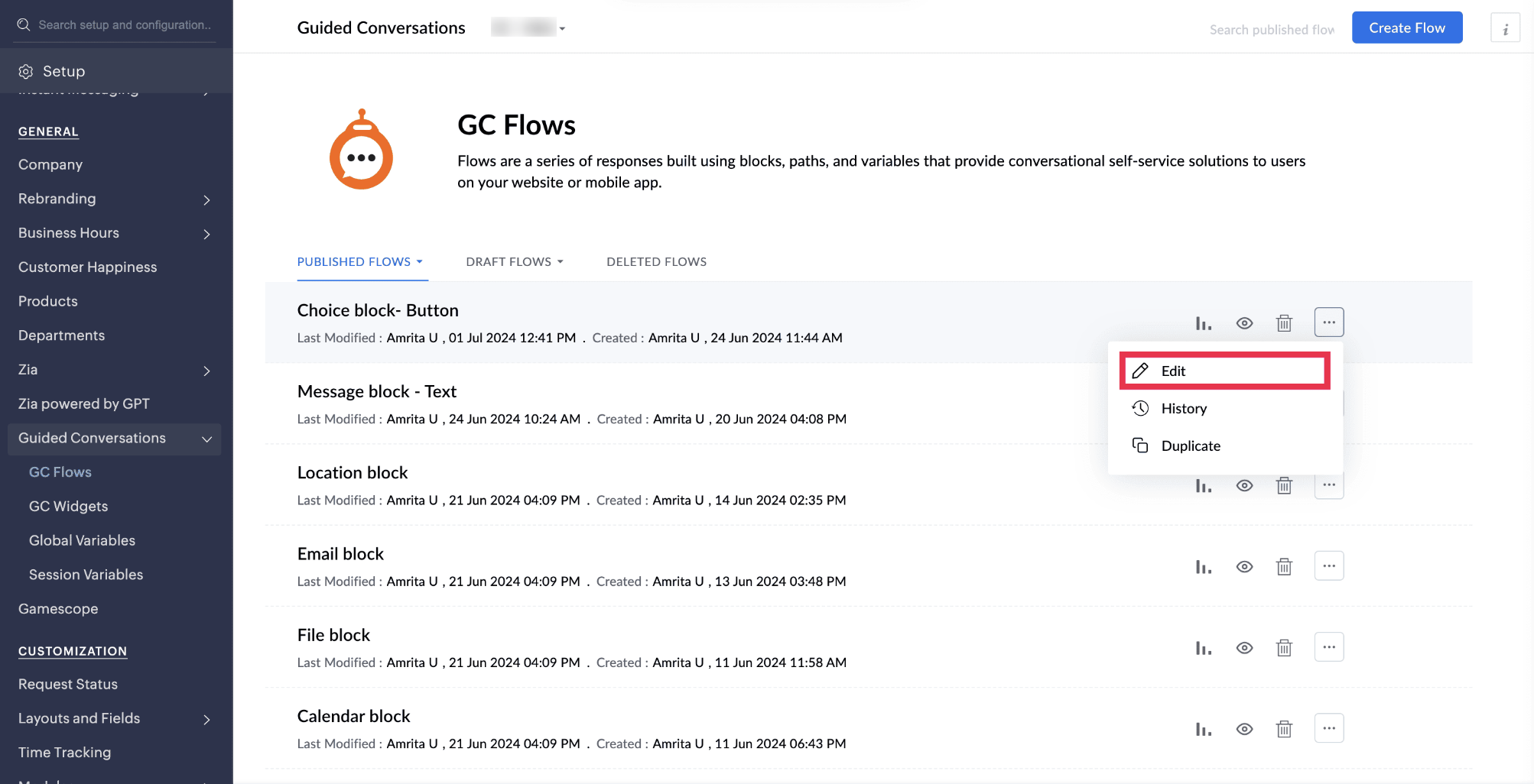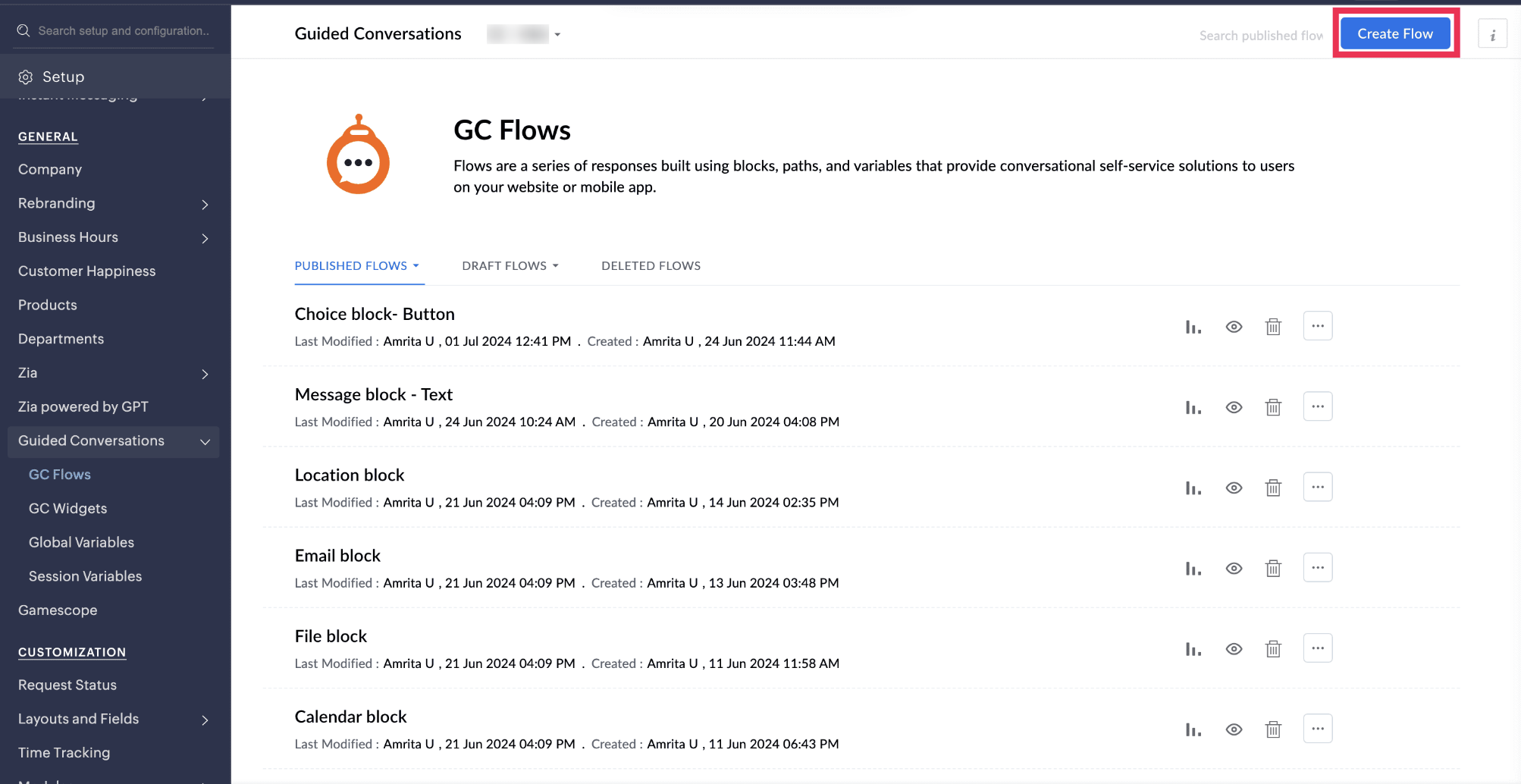 Blocks are the fundamental units of the Zoho Desk's Guided Conversations flow Builder. The GC flow builder offers blocks that cater to various business scenarios. Whether you need to display images or add emojis to create a welcoming message for your customers, you can achieve it all by using the appropriate blocks in the flow you are building.