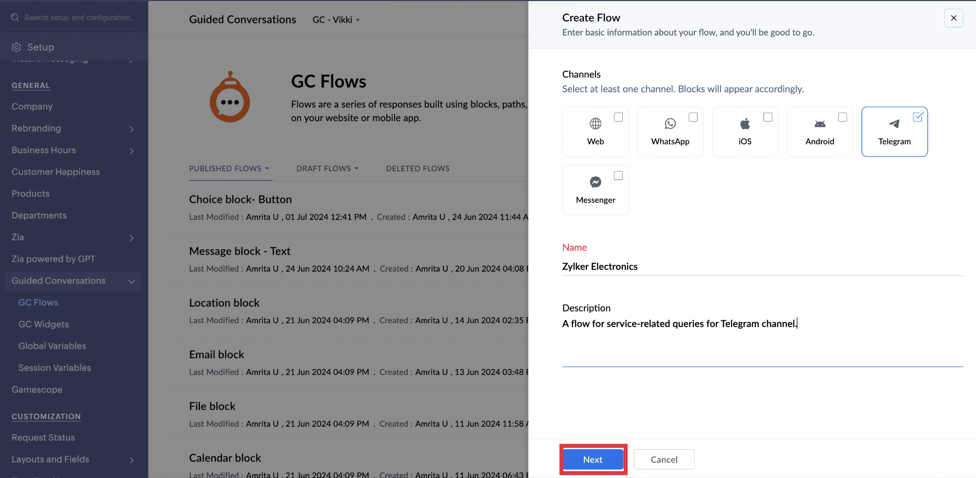 3. In the Create Flow form, enter the Name and Description, choose the Telegram channel for the conversation flow, and click Next.