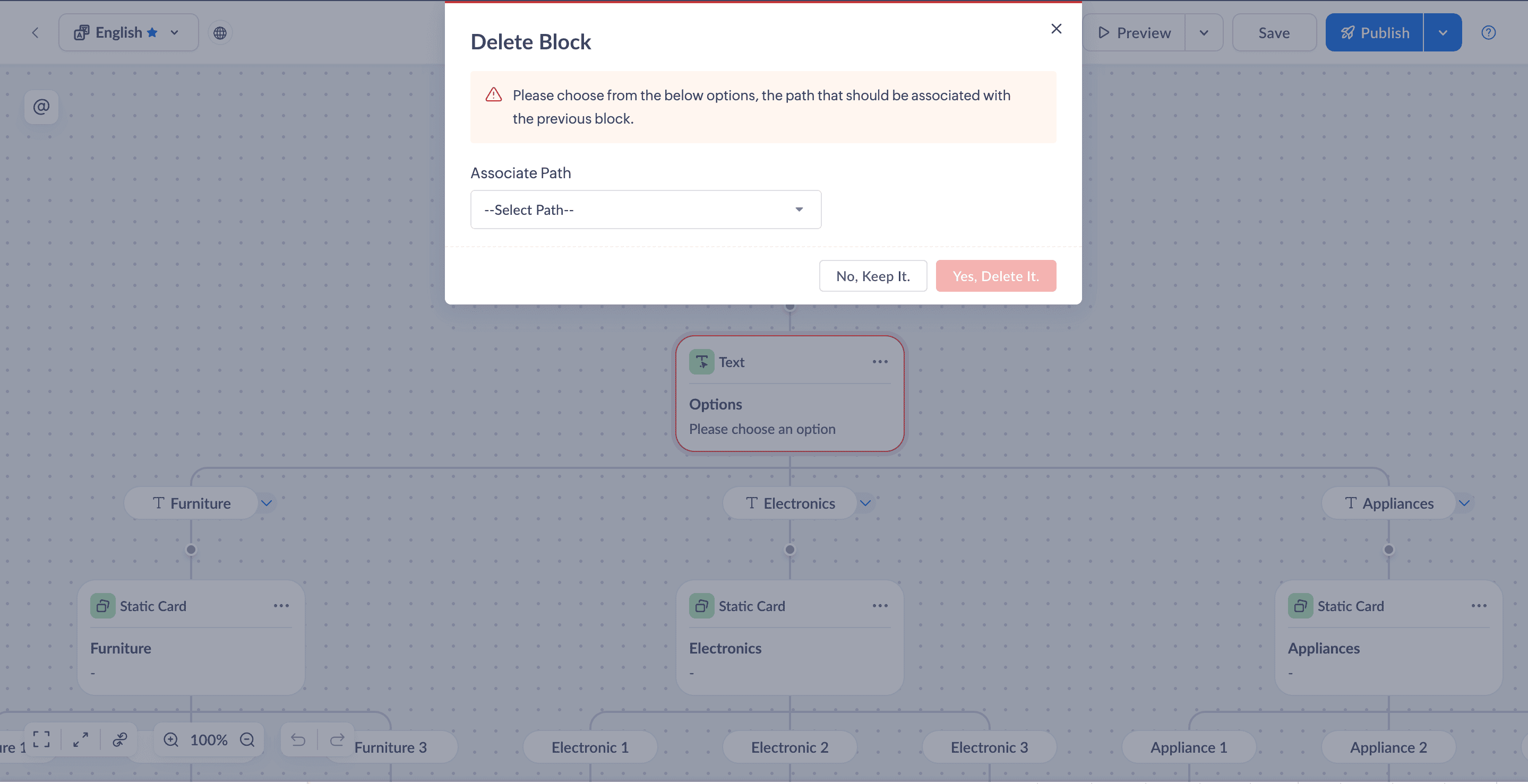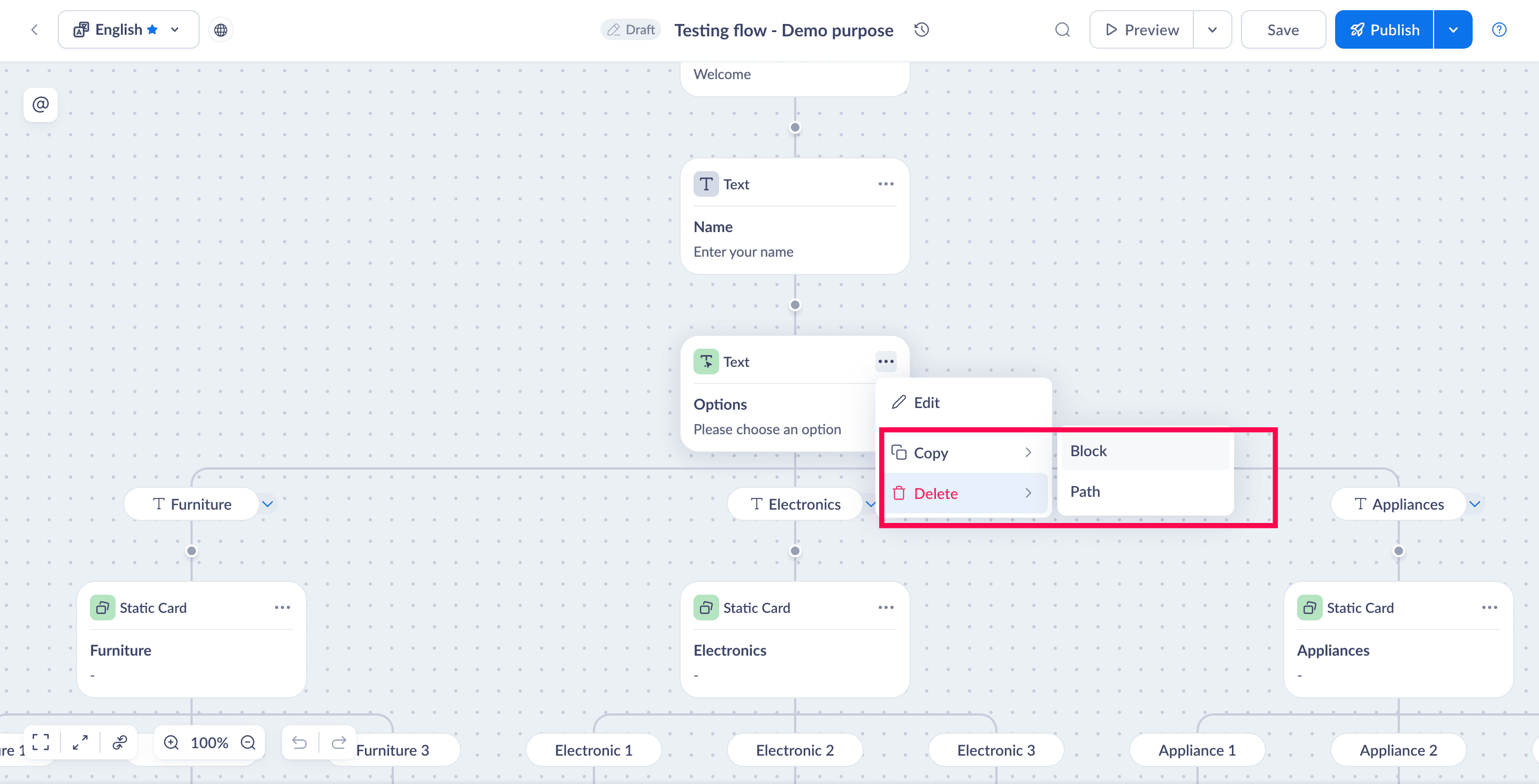 - If you delete a block while an end user is engaged in a live session with the bot, the previous version of the flow will be rendered until they restart the conversation.