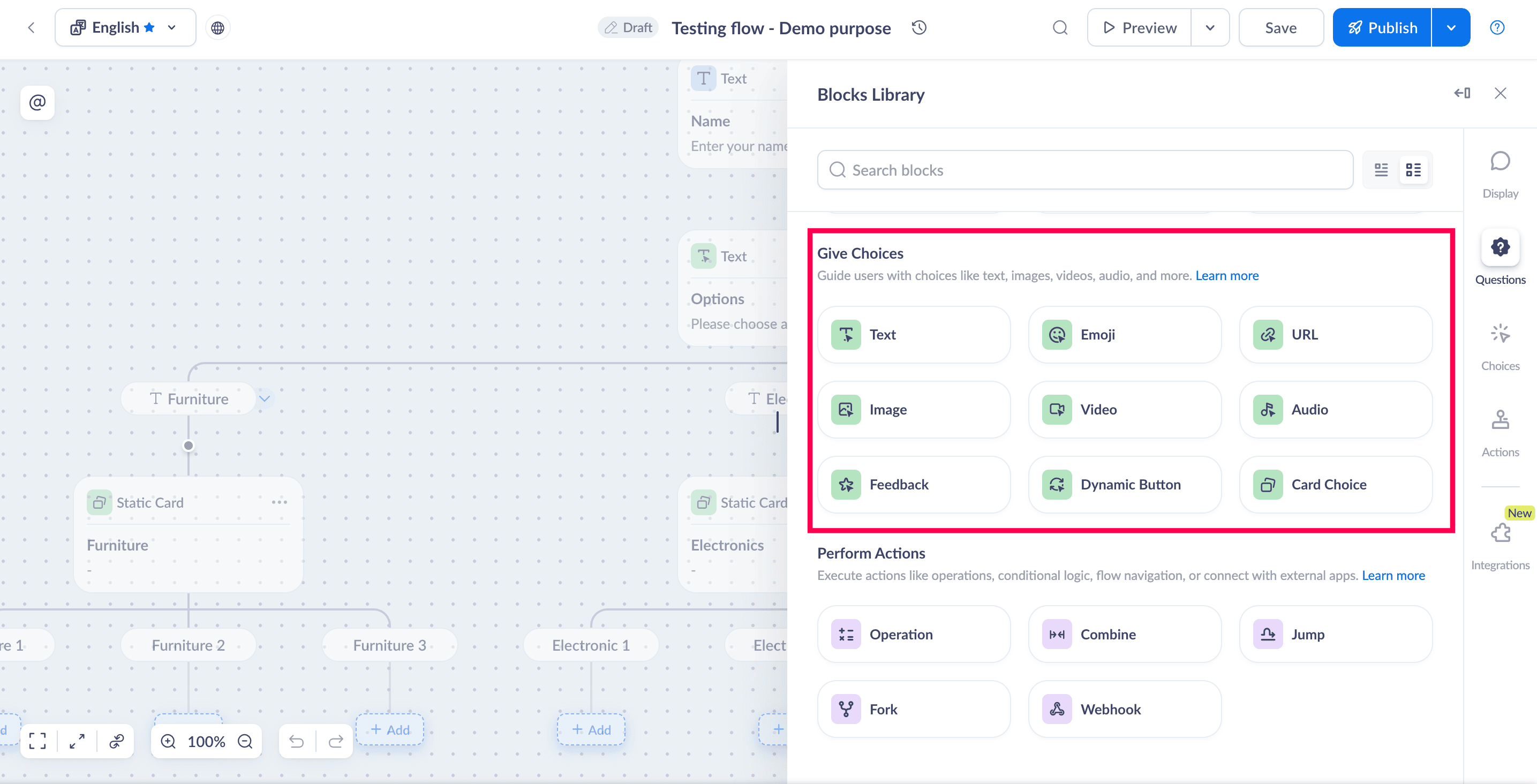 Selecting the required type ensures that the chosen option is displayed to the user and simplifies the process of building the conversational flow