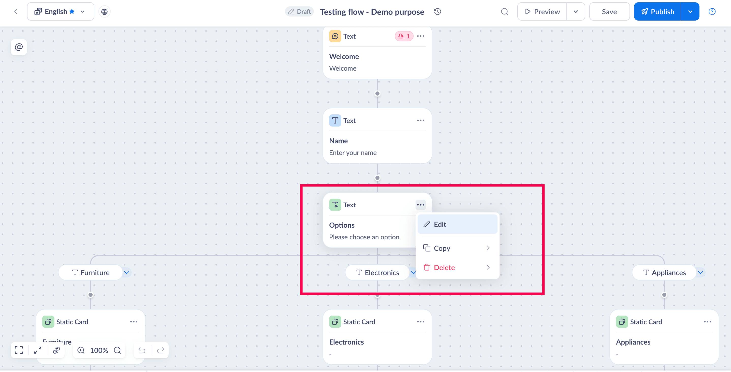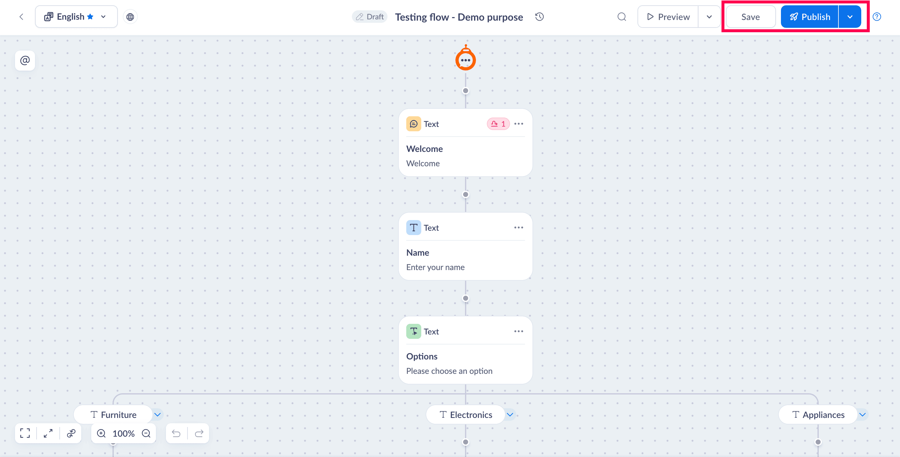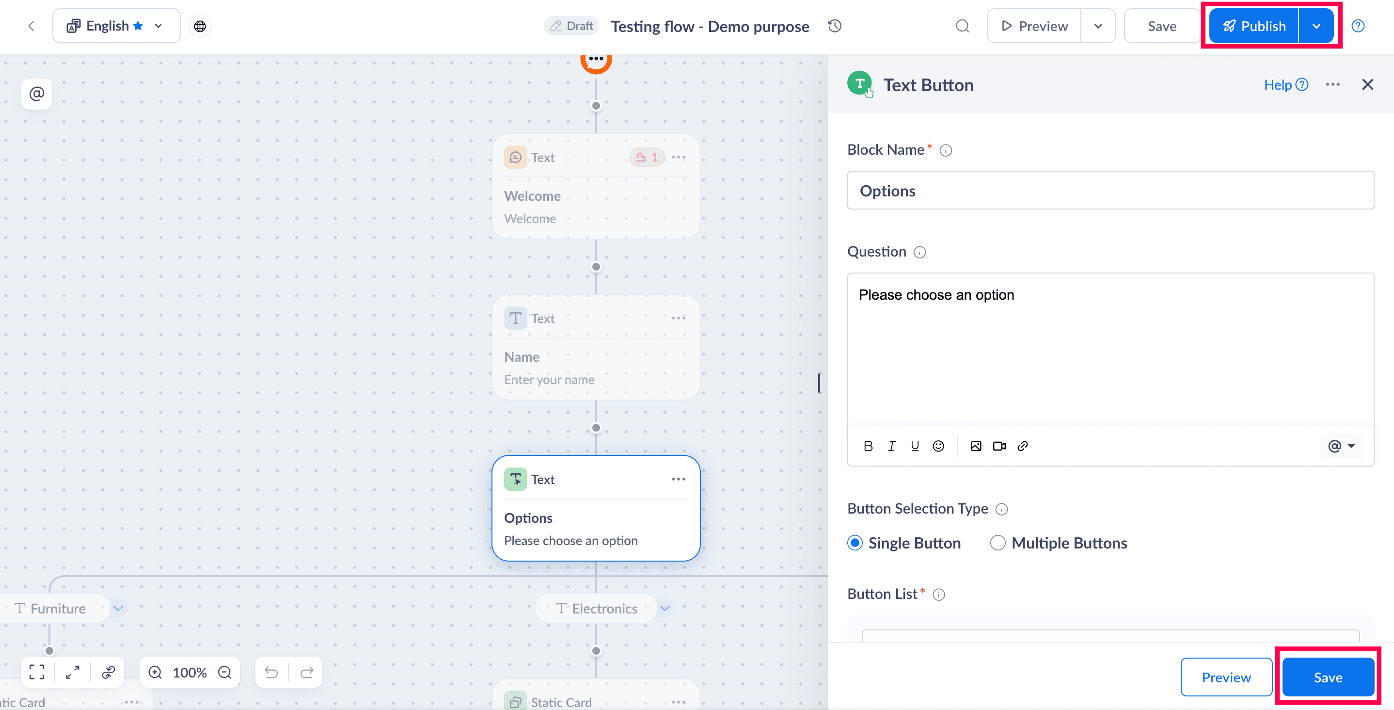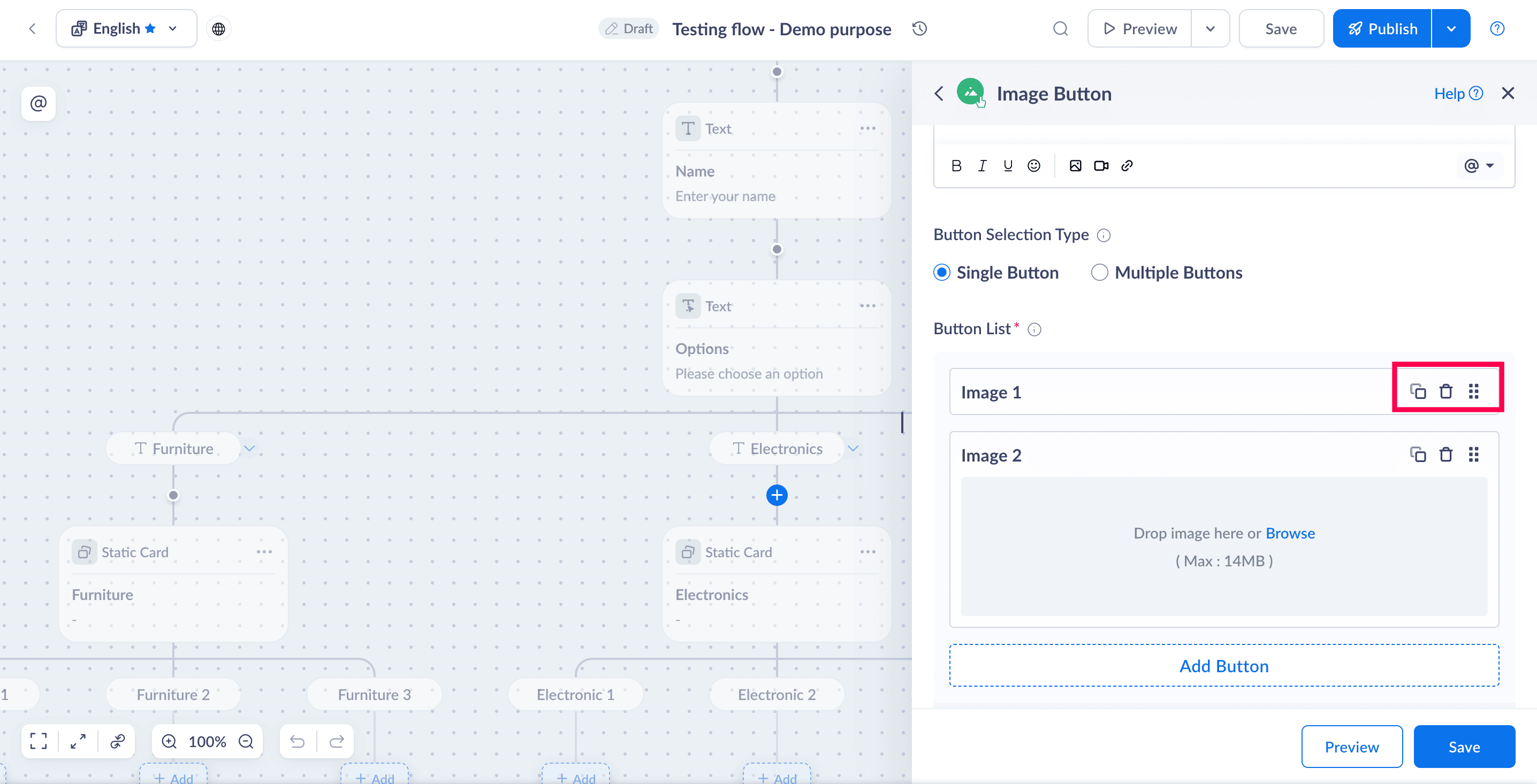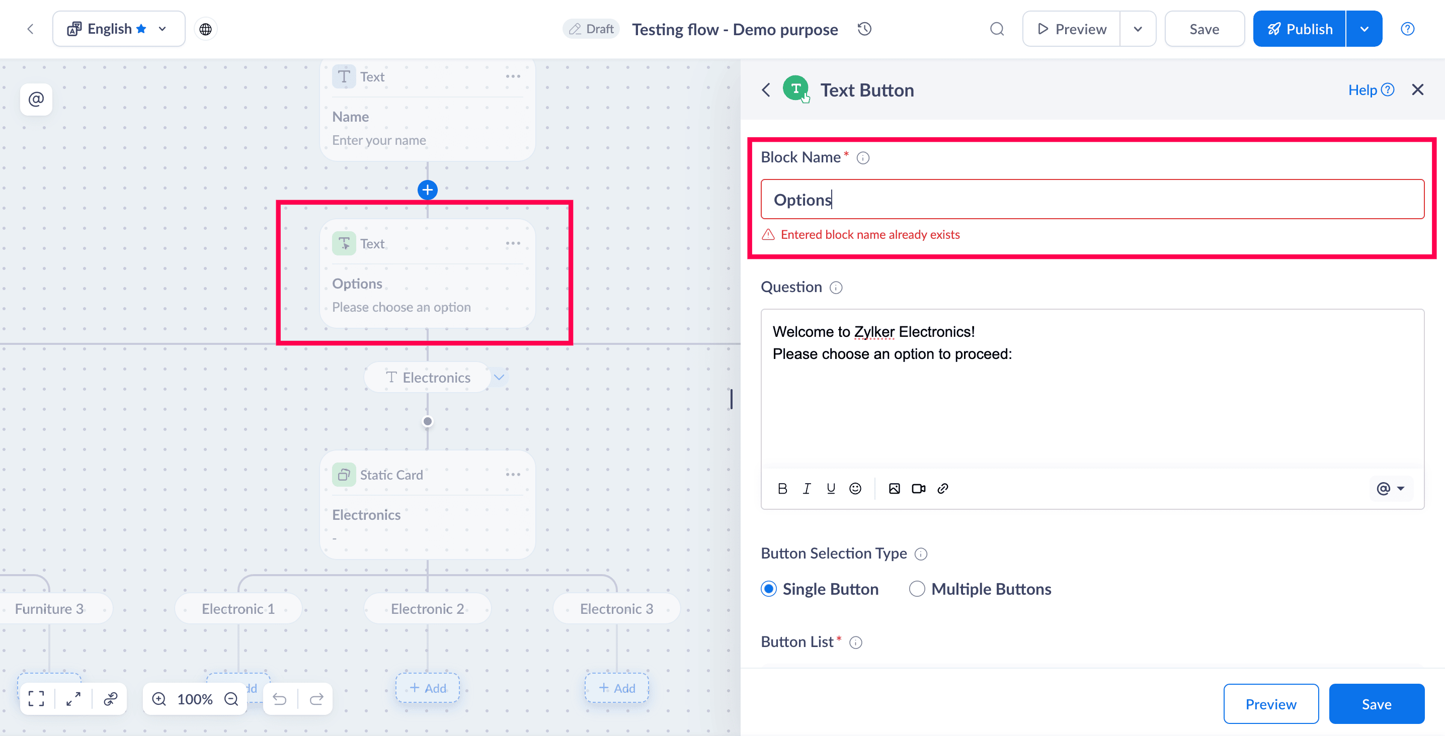 - When duplicating an existing button, all of its content will be copied. You must edit the button's name and change it before publishing the flow.