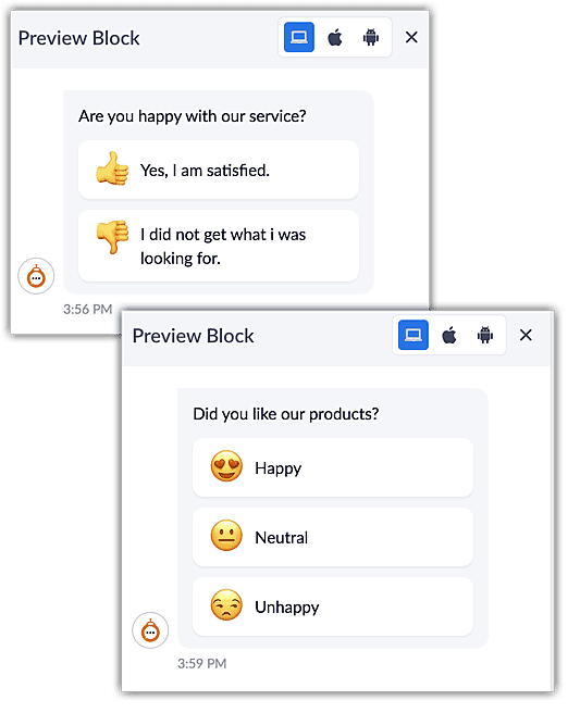 Examples of the output from GC for the Feedback and Smiley button blocks: