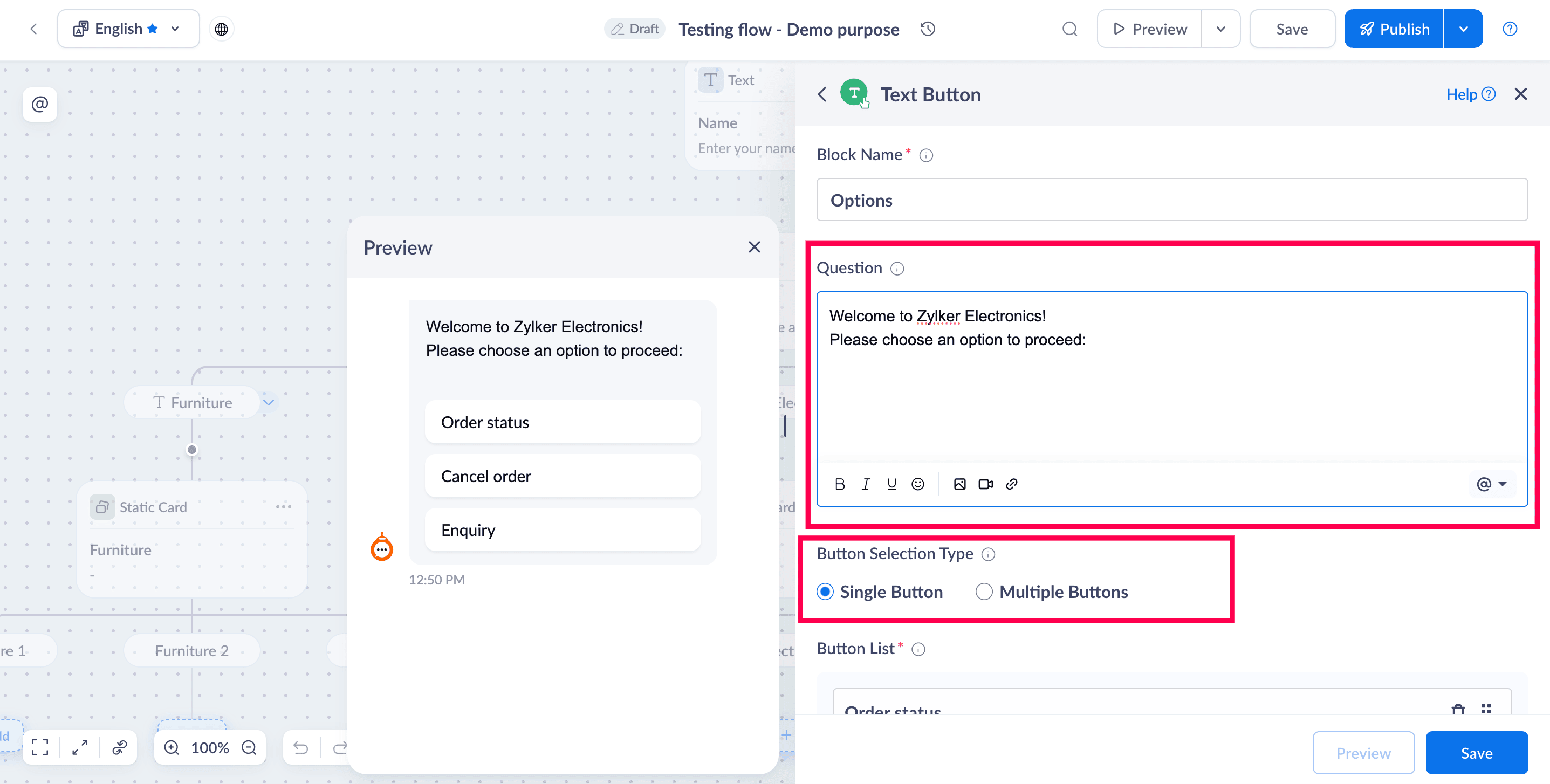 By allowing users to select one or more options from a predefined list presented as buttons, it ensures clear communication. For example, for an online shopping chatbot where users are prompted to select their preferred payment method, the button block can display buttons labeled with different payment options like "Credit Card," "PayPal," and "Bank Transfer," making the selection process straightforward and user-friendly.