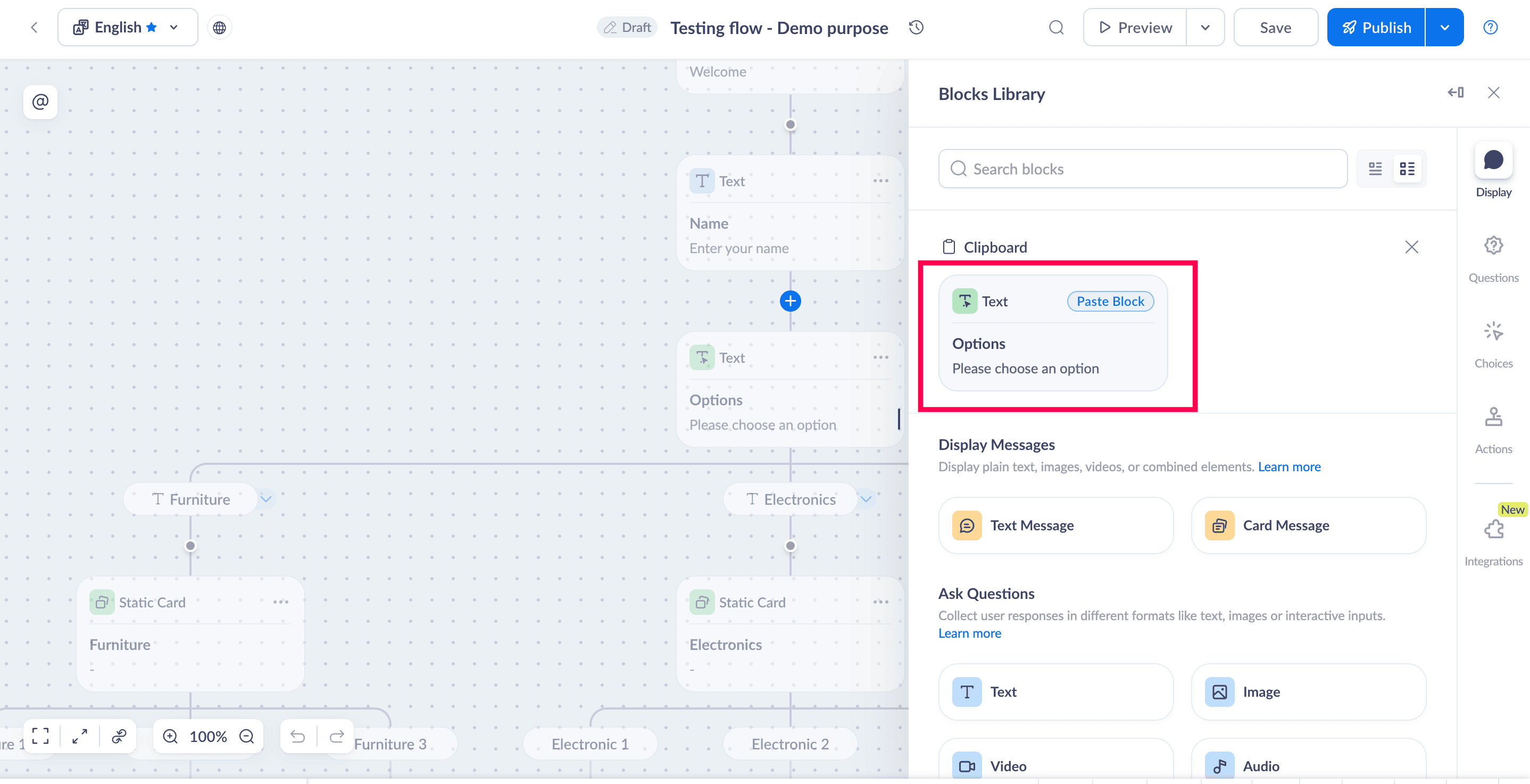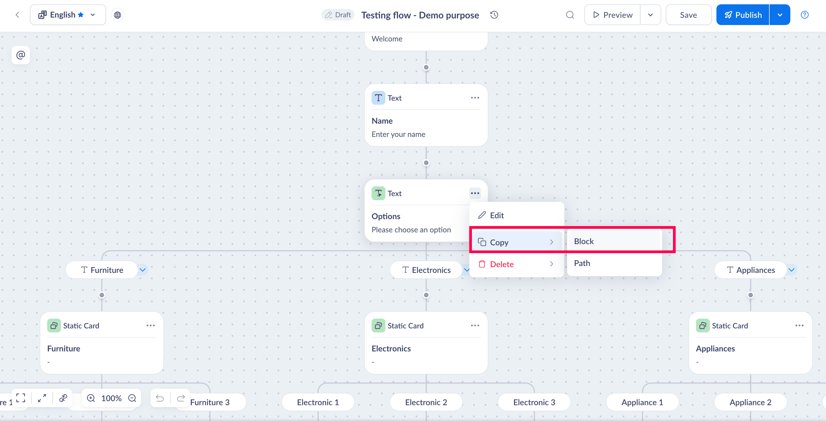 The Copy Block option can be used when you need to reuse a block that you previously created. You can copy that block and add it to your flow as it is or edit it according to your needs.