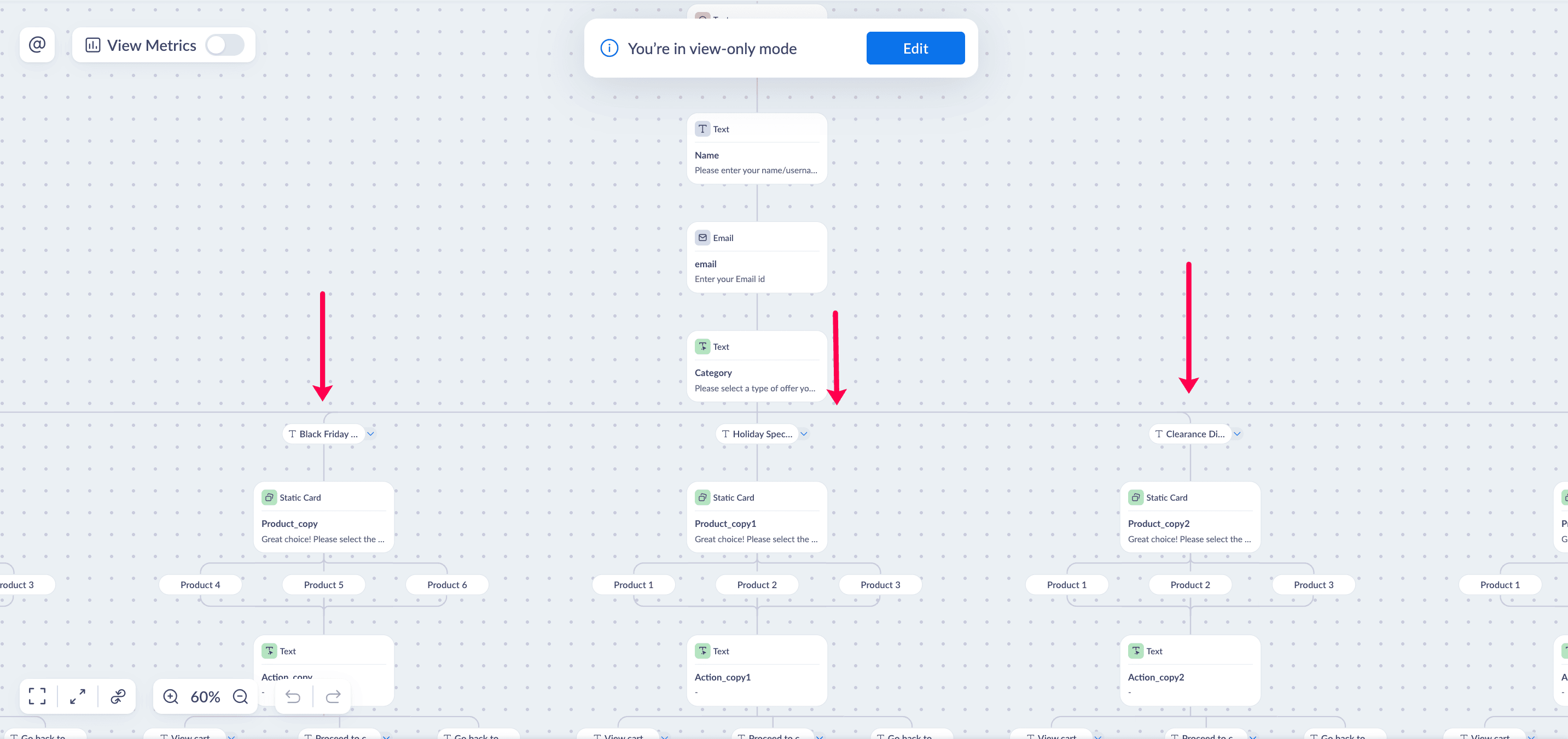 In both cases, the conversation flows will differ from each other, so two separate paths should be built. Each path will comprise different sets of questions and options to provide self-assistance to the customers.