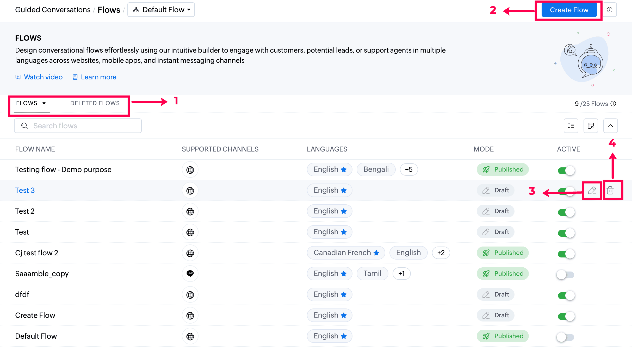 Manage flows that are no longer needed by moving them to the deleted flows section. Deleted flows can also be retrieved if required as they will not be permanently deleted until you choose that option.